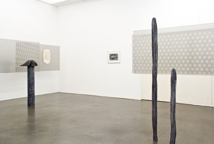 The second room has a simpler structure. It is based on a clear spatial and perceptual counterpoint: on the floor, a small group of sculptures, two of which (Smog I and Smog II, both 2017) are bronze casts of a cactus whose “smog colored” patina gives the show its title; hanging parallel to the wall, a series of perforated metal sheet rectangles on which the artist exhibits small ceramic and bronze sculptures. Conceived as exhibition props and arranged at different heights and depths, the rectangles evoke the dimensions of painting. They enhance the perception of the small sculptures as images, whereas the standing sculptures are experienced in the round.