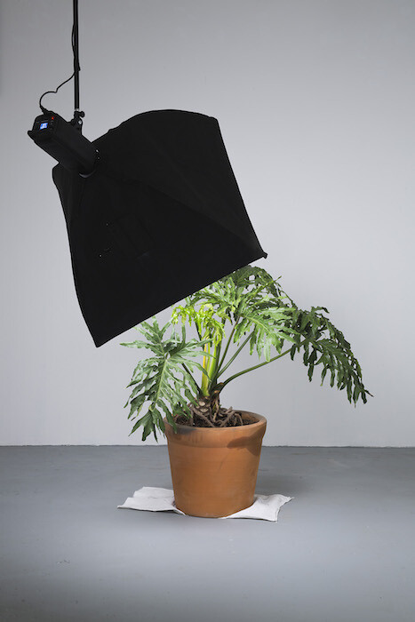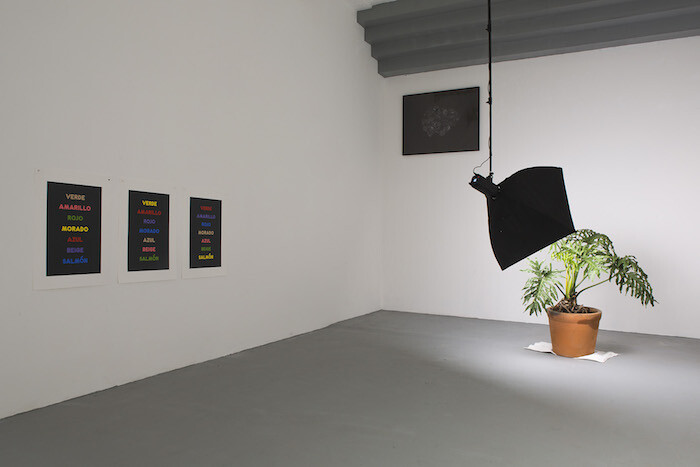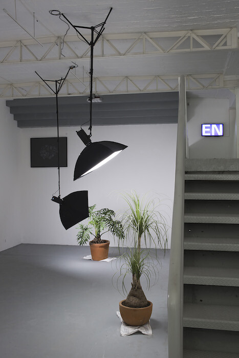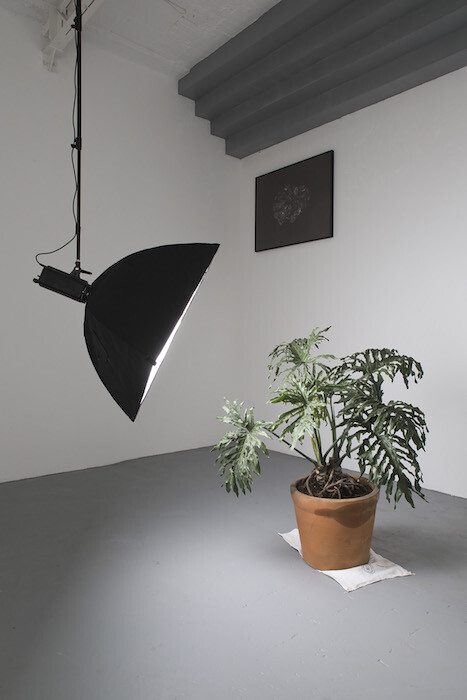 In Afasia, Riley states that he “now turn(s) and capture(s) negatives upside down.” (Tribe also thinks of the current political situation of America as being “upside down,” perhaps for want of better words.) This inversion is transposed to the gallery’s main room, which has been “mirrored”: the stairs leading up to it have been reproduced in the diametrically opposite location on the ceiling. This effect extends to two photographs of two sides of Riley’s favorite stone. A commonsense perception of gravity is also challenged through three photographers’ lights hanging from the ceiling, paired with three potted plants, common in Mexican interiors and balconies, heavily settled on the floor. Each mirrored pairing constitutes a work: Ceiling light (Cuerno de chivo) [Alpine wood fern], Ceiling light (Pata de elefante) [Elephant’s foot], and Ceiling light (Garra de león) [Philodendrom Selloum] (all 2017). Nature and artifice are at play in the setup, in which vegetation serves as a prop. At the same time, the ensemble complicates the dichotomy of ornament against function, and the relationship between what is being shown and the devices that enable the display.