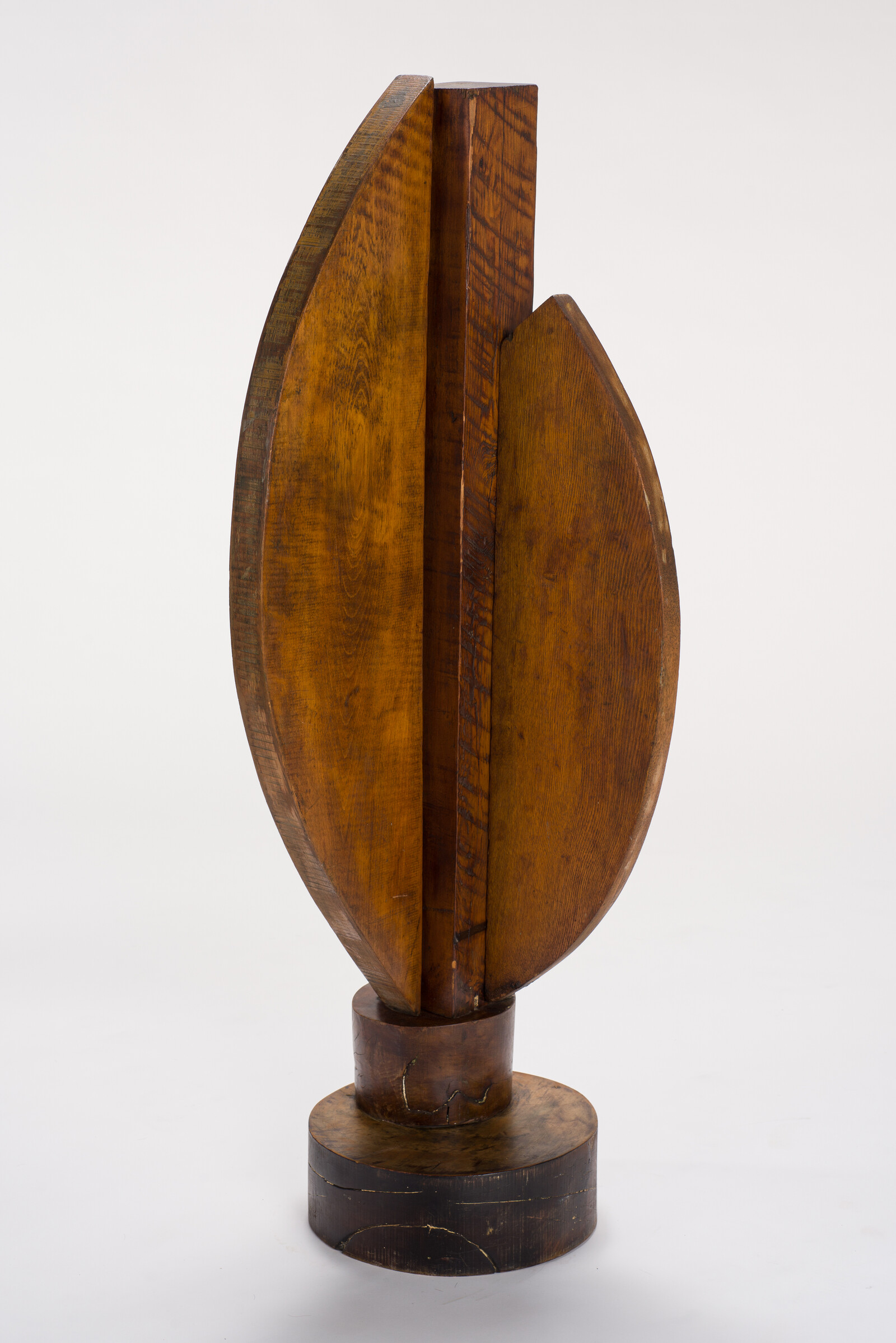 Kim Lim’s dark wood sculpture Pegasus (1962) is an earthbound, stiff-backed version of the mythical flying horse. Shaped like a totem, it has no discernible head or legs, only a central column to which two slim semi-circular pieces of wood (the “wings”) are hinged. Pegasus, steed of the muses and symbol of the unbridled imagination, is portrayed here with a certain restraint. In fact, the sculpture reminds me of a practitioner of another disciplined art—a straight-backed ballerina moving between first and second positions, arms opening and closing gracefully.