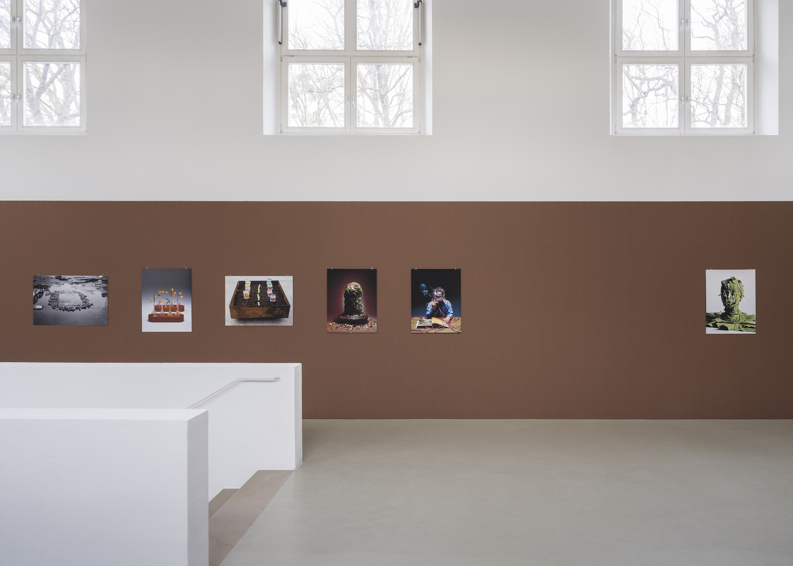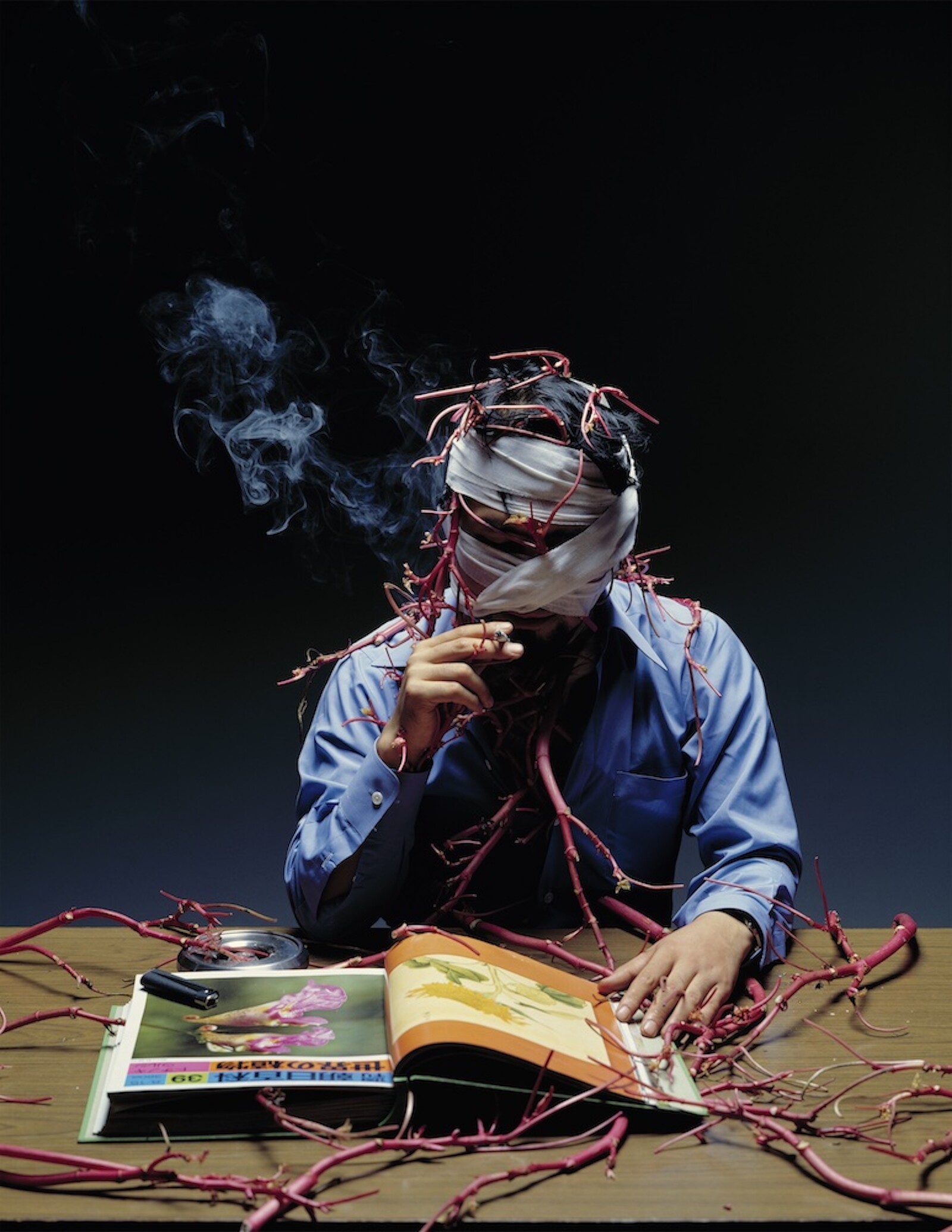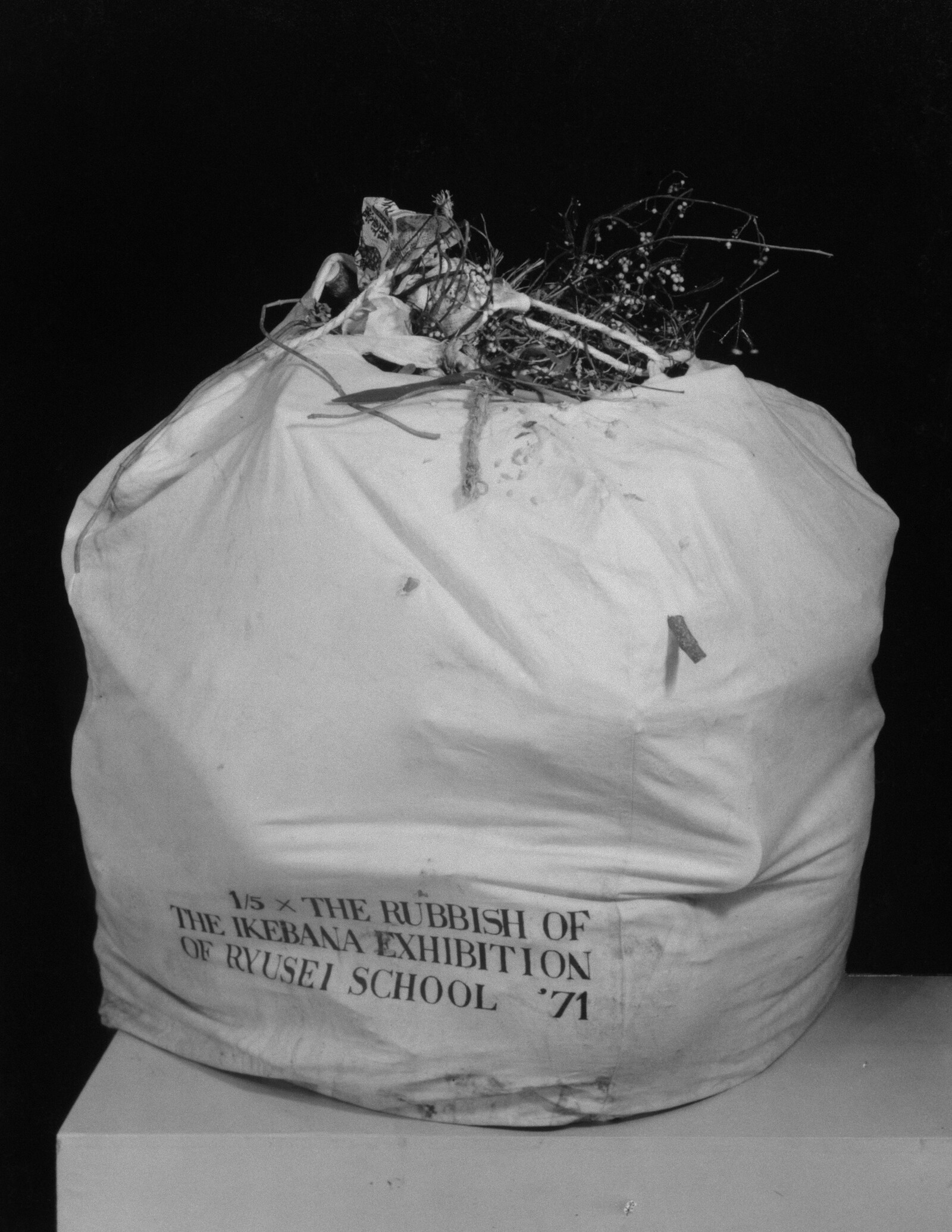 Ohtsubo studied under Kasen Yoshimura at the Ryūsei-ha Ikebana School, and his teacher’s inclusion of vegetables and non-organic materials such as metal and plastic had a strong impact on his work. The artist has since become a cult figure for those interested in more-than-western contributions to histories of performance, Minimalism, and Arte Povera, and in art’s continued engagement with what is left of “nature” in the Anthropocene. In Munich, photographs documenting his long career and radical creations include an image of Ohtsubo in a bathtub covered with flowers and leaves, smiling at the camera (I Am Taking a Bath Like This, 1984); of an aloe vera branch surrounded by crunched ping pong balls in a wooden box (Like an Umbilical Cord, 1974); a portrait of the artist smoking while wrapped in white bandages and long castor bean plants (Botanical Man, 1978); and of a large bag filled with the leftovers of an ikebana show (⅕ the Rubbish of the Ryusei Exhibition, 1971).