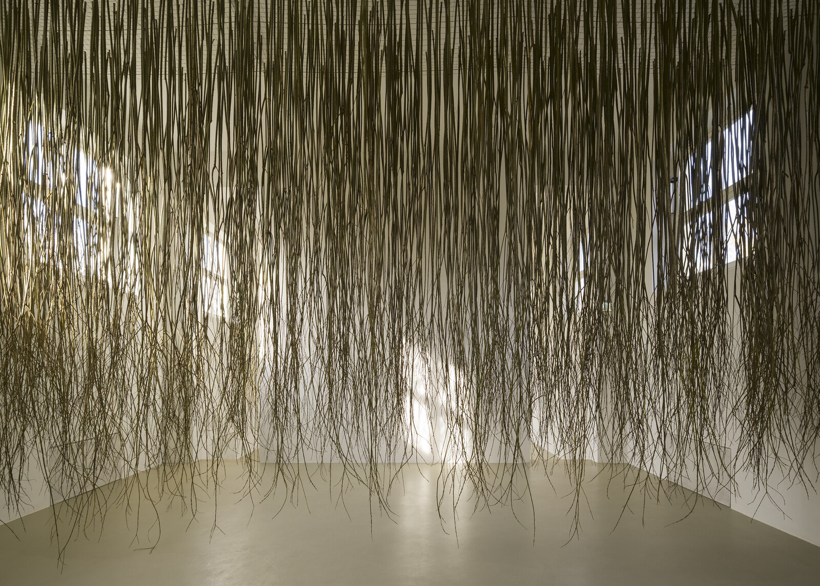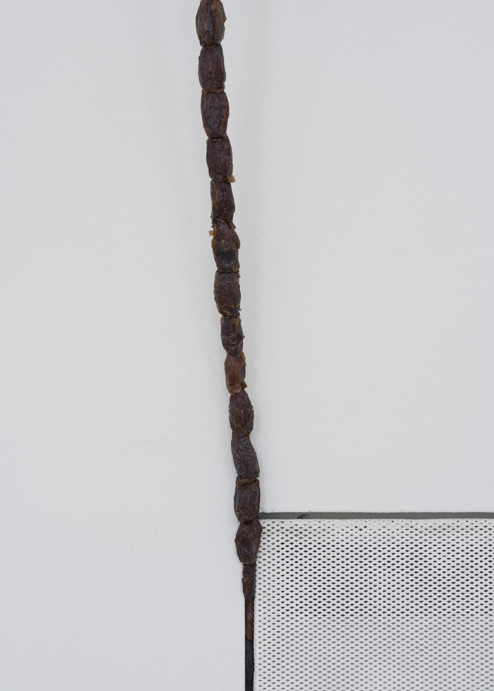 In 2013, artist Christian Kōun Alborz Oldham came across Ohtsubo’s work and started training under his guidance, a process that culminated in this exhibition, which celebrates their collaboration and friendship. Both artists present their own ikebana creations, each of which reverberate with the other’s forms, movements, and spatial arrangements. Ohtsubo’s Willow Rain (2025) is an environment made of 800 basket willow branches suspended from the ceiling. It creates a portal composed of thin, long strips of dried plants that, inverting the natural order of vegetal growth up from the ground, invites viewers to look upwards, both to the suspended plants and to the hypnotizing shadows they cast upon the walls. In the surrounding spaces, Oldham’s Dateline (2025) consists of Medjool dates strung on lightning rods, merging minimalist aesthetics with reference to a staple Middle Eastern food. By creating curvy, wavy lines that emerge from the walls and force viewers to circulate around them, Dateline establishes a counterpoint to the vertical movement of the Willow Rain and choreographs visitors’ movement across the space.