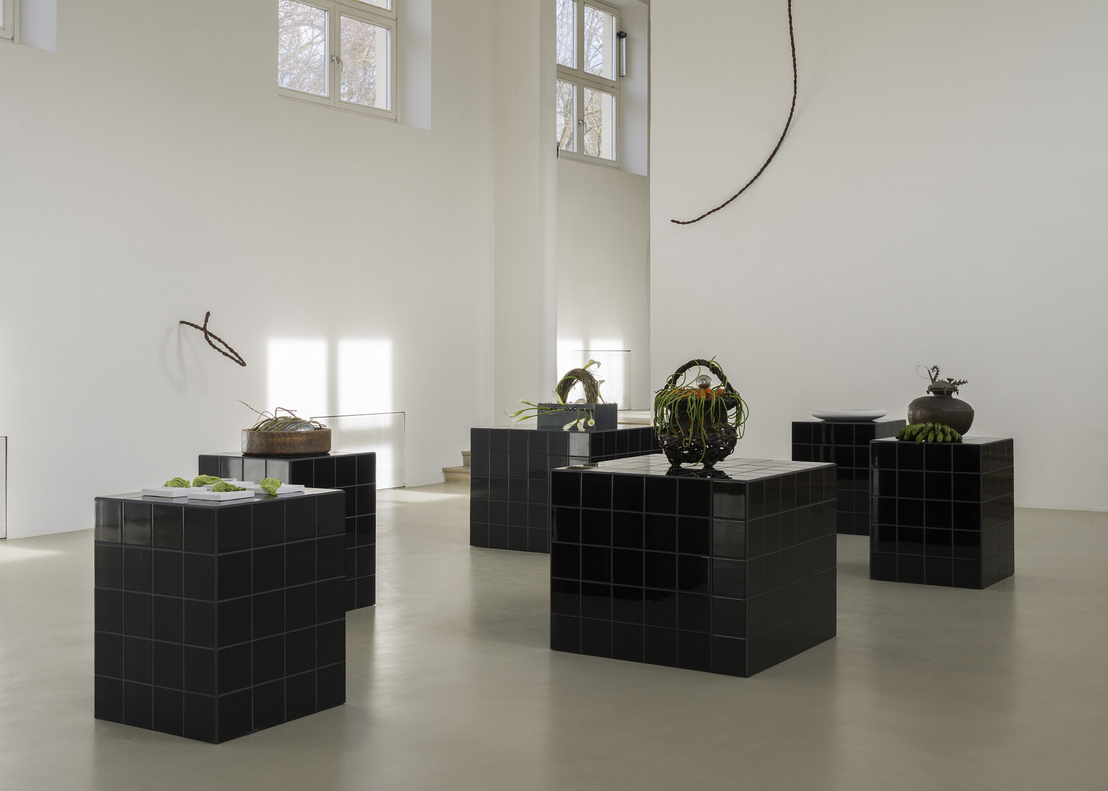 The show’s central work is Ohtsubo’s Linga München (2025), made of 300 basket willow branches arranged in a circle more than two meters in diameter, with thousands of flowers and leaves scattered within and around it. It is very tempting to touch it, to rearrange the buds that lie on the ground, to enter its hollow center; it smells of spring meadows and florists. The branches’ arrangement resembles a bird’s nest in its remarkable balance between disorder and skillfulness. Calling this ikebana feels awkward—as if Simone Forti’s Huddle (1961) and Mario Merz’s igloos could be ikebanas too—but also liberating and transformative. It allows ikebana into the history of art, rather than treating it as an art with its own hermetic traditions. The practice thus becomes a method of questioning nature-culture divisions, and much more than a highly coded grammar only for initiates.