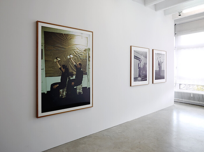Back in Poland, three years before, The Monument without a Passport was loaded with unfulfilled dreams. Kwiek and Kulik had planned to attend a conference in Arnhem, in the Netherlands, before realizing that their passports were still revoked. In place of their trip to Arnhem, they accepted an invitation to an arts festival in the Polish town of Sopot. There, they enacted the full spectrum of the transitive relations around resistance. Their photo series starts with an explanation of why their passports were withdrawn. But performing resistance does not only involve a confrontation of power, but also the theatrical scenery of the performance itself. They decide to divide the audience. Selected friends see Kulik’s head sticking out of a table while she reads a statement about the event that led to their passports being withdrawn. The rest of the guests see her standing, still her head stuck in the table, while her feet are fixed in place with clay, like a plinth for a sculpture. The performance ends with an image of the couple in a heroic pose common to Soviet monuments, unveiling a scripture on the wall with the title of the piece. This course of events adds the public to the bifold relation of resistance—not as a neutral beholder, but as a divided entity itself. Both the artists’ tacit complicity with power and the theatrical dimension of resistance become part of the performance. With this reflective approach, their work acquires a timeless meaning. Given our current economic and political situation—with ever-more powerful state apparatuses of surveillance and growing movements of resistance—there is more than one good reason to give the work of KwieKulik a closer look today.