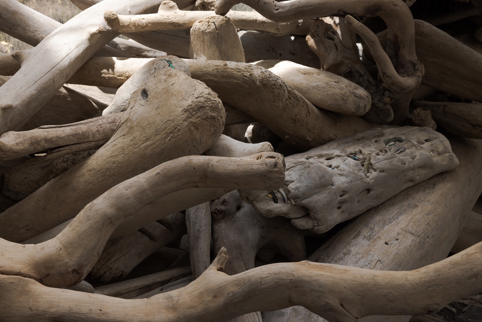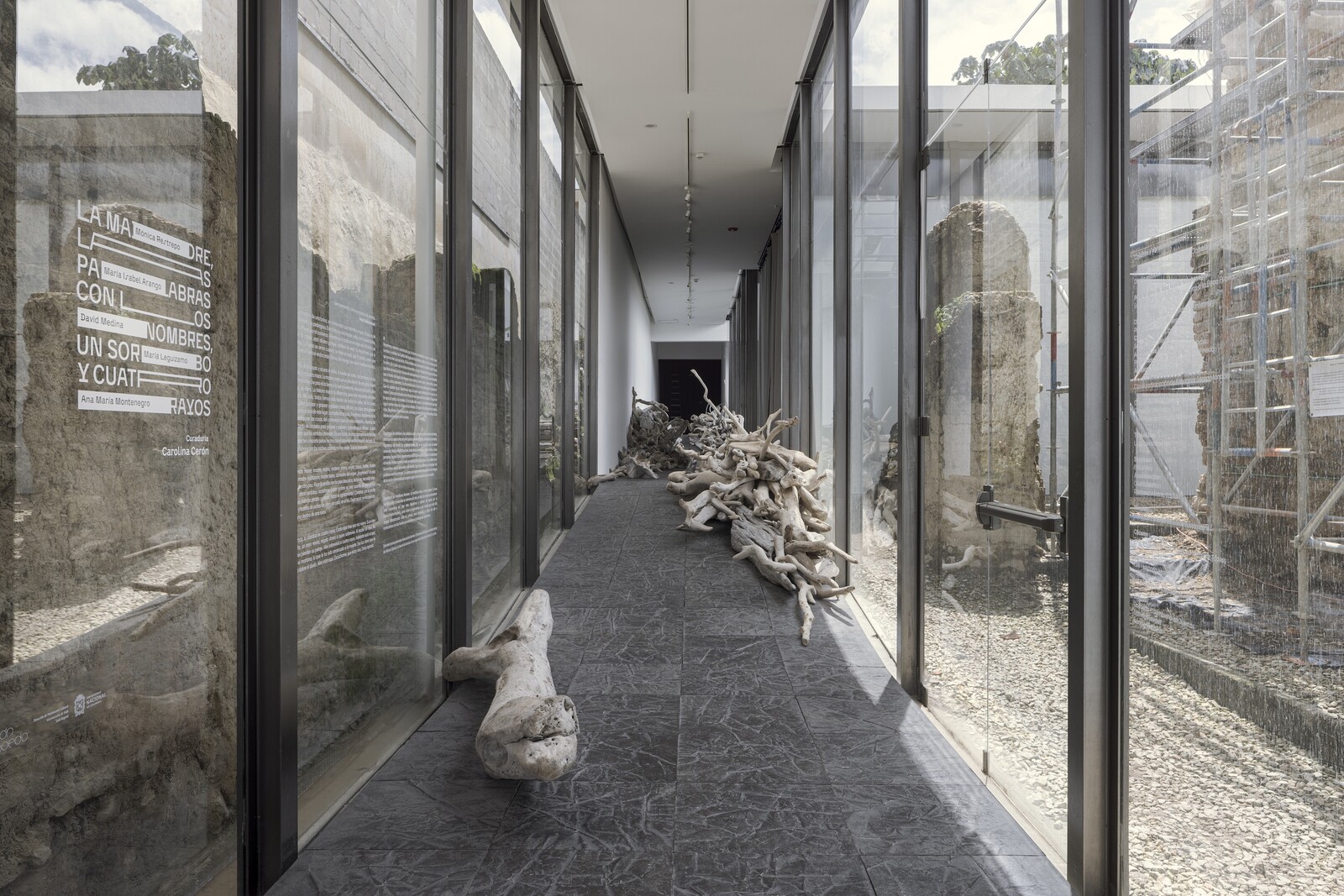 Entering from the street, visitors encounter the long hallway of the building lined with piles of tumbled, sun-bleached driftwood, which form a meandering riverscape. This is Sorbo [Sip (2024) by María Leguizamo. The waist-high piles are meant to resemble a river shoreline, and also suggest volumes of bones of the missing disappeared into the river. A gentle hum subtly prompts visitors to touch the wood and feel its vibrations, as though the river’s bones tell a story we can only understand through bodily perception. Leguizamo acknowledges how experience, violent or otherwise, changes people and societies, in much the same way as these logs were changed by tumbling in the Magdalena river, from which they were collected.
