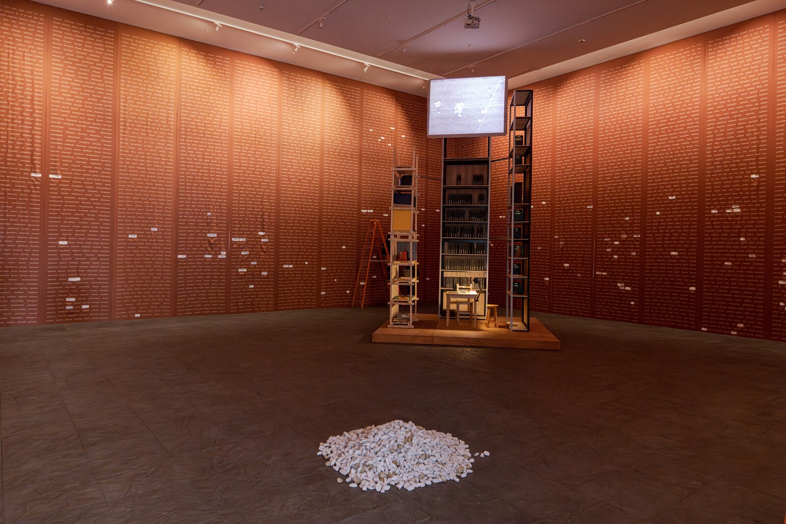The main gallery groups three pieces, Palabras, palabras, palabras (2024) by María Isabel Arango, Todo Nombre es mi nombre (Gramática Nacional) (2024) by David Medina, and Mater/Madre (2024) by Mónica Restrepo. Mater/Madre is a small pile of papier-mâché forms of the hollow space inside a fist, made by the artist shredding and sculpting pulp from official but unidentified documents from the Ministry of Culture with her hands. Beyond the small heap stands Medina’s installation of a desk surrounded by high shelves displaying collections of books he has adapted using AI. One remixes the first and last names of the national registry of victims to produce a false but plausible compendium of names totaling the number of victims of the war. Another swaps words in a collection of books that President Samper decreed in 1996 every Colombian family should have in their home library, in an effort to unify the nation through state-imposed literary references.