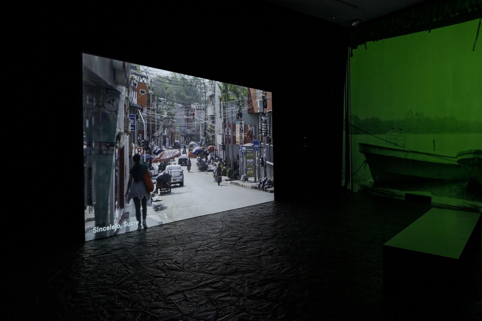 Riffing on a similar idea, in a small gallery to the right, Ana María Montenegro’s La Claridad (2024) is a two-channel video installation recounting the experiences of Alex, a Colombian army conscript who was struck by lightning four times and miraculously survived all four strikes. Alex and his aunt emphasize how, according to local healers, being struck by lightning changes a person. If the electricity is not sufficiently discharged into the earth, lightning will continue to seek them. The video narrates Alex’s experience surviving the lightning strikes, but also examines the medical and local healing treatments, the social stigma, and the legal restitution process he went through, metaphorically alluding to the shock of war, displacement, and abandonment that communities across Colombia experienced between roughly 1958 and 2016.