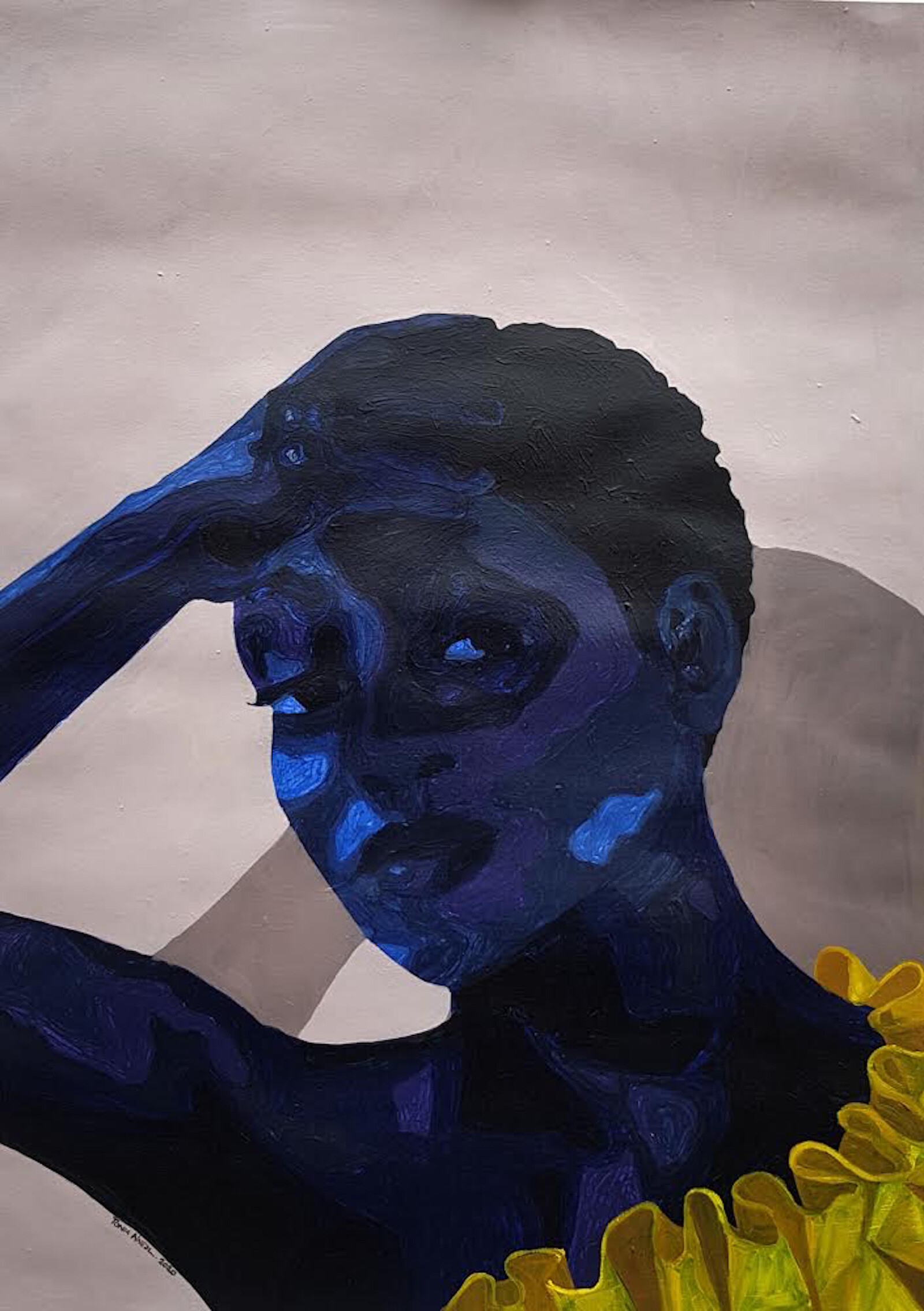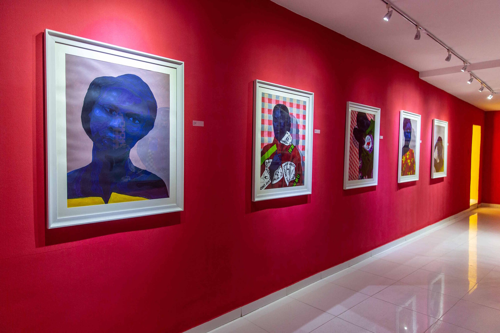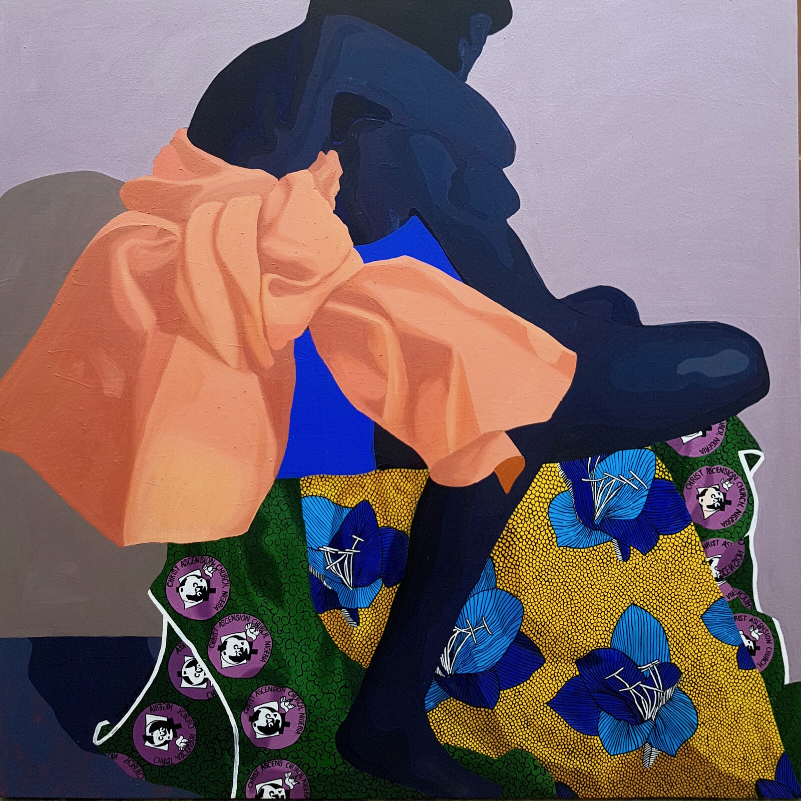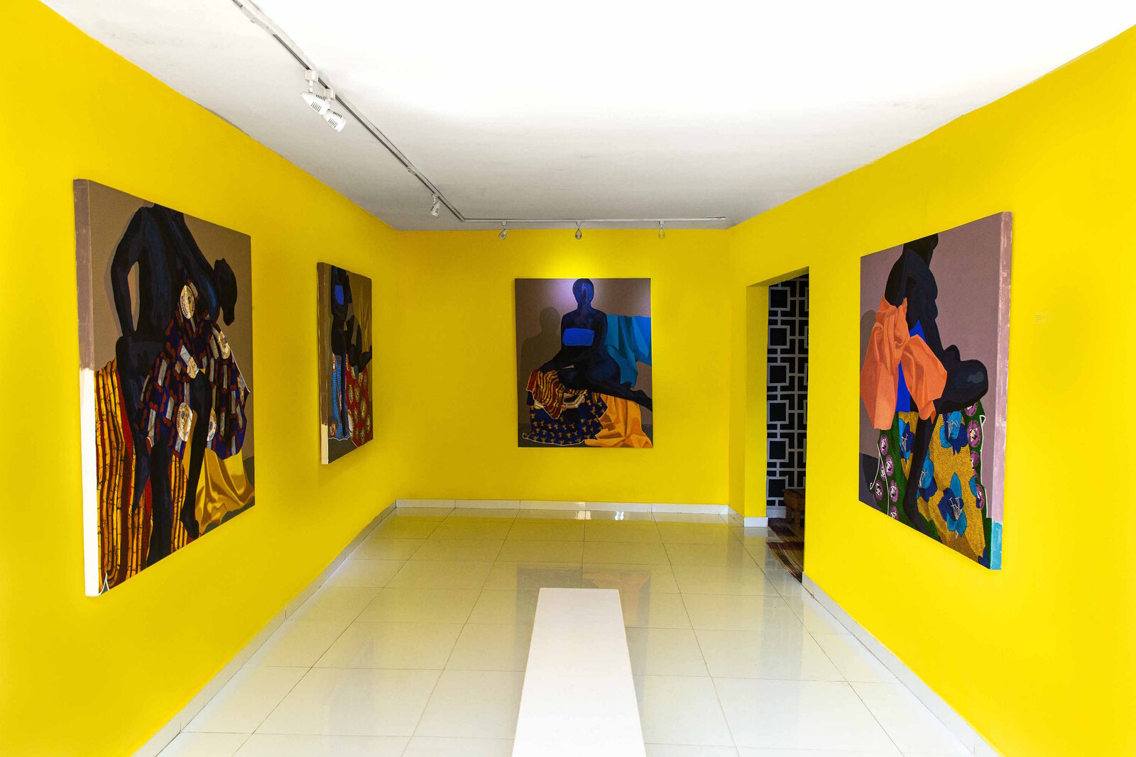 At the nearby Rele Gallery, Tonia Nneji’s exhibition “You May Enter” invites the viewer into an intimate engagement with female pain via the artist’s own experiences of living with Polycystic Ovarian Syndrome, a hormonal disorder common among women of reproductive age. The walls are painted a deep red in one gallery and yellow in the other, exchanging the sterility of the white cube for a warm and contemplative environment well-suited to these highly personal paintings. Exploring Christian belief systems and communities of care formed around the experience of emotional and physical trauma, the works feature figures painted in indigo and midnight blue hues (a combination of acrylics and oils) who tenderly embrace, or gaze contemplatively. In See Through 2, a forlorn female face looks out at the viewer with her hand on her head, as if in defeat, or disbelief. A standout work, Sooner or Later, sees two abstracted figures embrace, fusing bodies and limbs while seated on stools draped in Ankara fabrics emblazoned with popular patterns and the logos of local church societies. These reference the artist’s search for religious-based cures, as well as the valuable commodity of the textiles Nneji’s mother sold to finance her daughter’s treatment. The fabric also reintroduces the artist’s recurring use of forms of shroud—as concealment, a place to hide, or as a protective layer to bodies in the process of healing. Nneji’s powerful portraits make visible the pain women are too often encouraged to hide away.