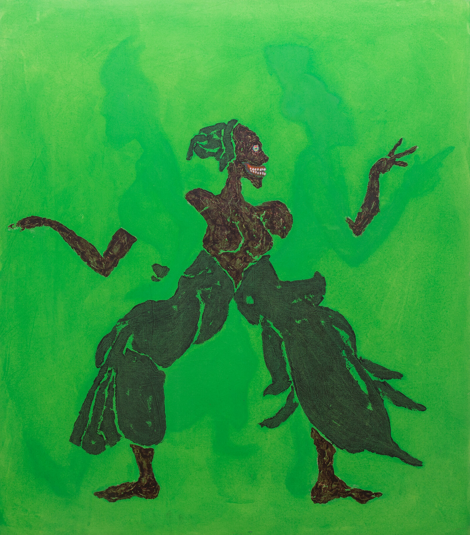 At the newly inaugurated kó gallery, founded by Kavita Chellaram, collector and founder of Arthouse Contemporary, Thebe Phetogo’s “blackbody Composites” explores figuration and a politics of blackness drawing on the artist’s experiences growing up in his native Botswana, and on time spent in Lagos earlier this year as an Arthouse resident. The exhibition takes as a starting point the scientific “blackbody”—in physics, defined as a surface capable of absorbing light of every wavelength—and goes on to reference liberation struggles against apartheid in South Africa, Nollywood, Igbo masquerades, organized labor exploitation, and nineteenth-century minstrelsy traditions in the US. Phetogo paints with oil, acrylic, and shoe polish, the latter reclaimed from its history of use in exaggerated caricatures of blackness by non-black performers. By connecting past and present injustices directed at Black folk, these works highlight that oppression is cyclical, and permeates every aspect of modern life. Paintings depict black figures against vivid green backgrounds resembling the chroma key screens used to create visual effects in digital filmmaking. In blackbody Composite (In Protest) (2020), a group of men, women, and children take a knee with their fists raised in a stance now synonymous with protest movements from Black Lives Matter to #EndSARS. On the other hand, blackbody Composite (Back to back) references the movement of Igbo masquerades, as incorporated into works by Nigerian Modernist Ben Ewonwu, an artist whose work inspired Phetogo during his Lagos residency. The resulting portrait conveys the gestures of a masquerade whilst seemingly emerging from behind a green screen, as if moving between real and imaginary worlds.