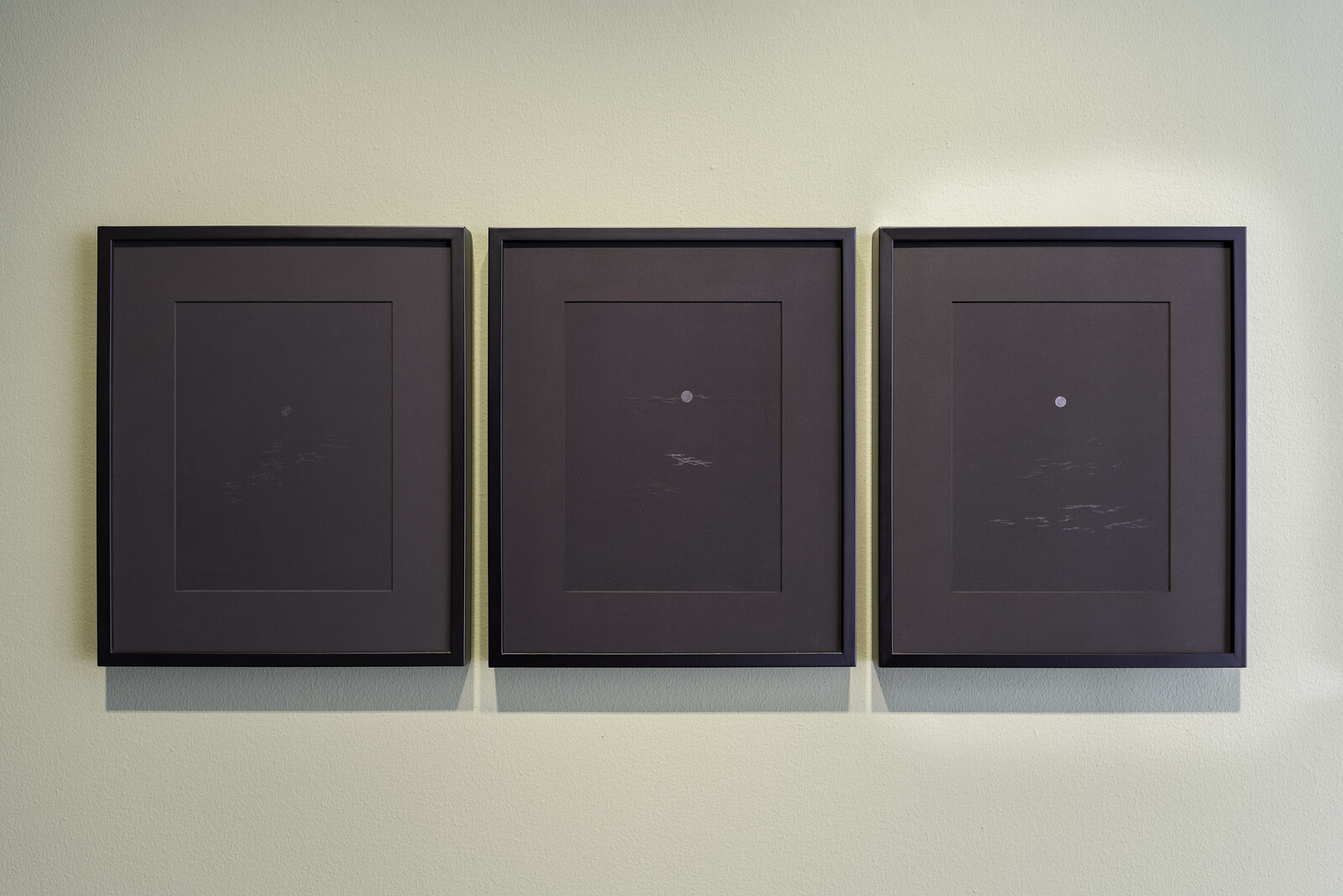 Hieroglyphics IV and V (2006–08) add music to this mix. Unlike its Western counterpart, Hindustani classical music does not have a standard notational system. It is instead taught and learnt using vocal and gestural cues (a clap of the hands or its intentional absence) imparted through embodied and intimate daily exchanges between master and apprentice. Lala adapted the qat—the rhomboid dot that is the basic unit of calligraphy—as a type of musical note to illustrate some basic rhythms and structures used in this musical tradition. Executed in silver paint on fragile carbon paper, the panoramic format of these drawings impels us also to read them as nightscapes, the repeating patterns of glittering dots resembling distant city lights seen from sea or a stream of passing ships viewed from a beach, recalling both Lala’s earlier work and what followed soon after. Pushing her minimalist convictions towards degree zero, in the triptych Moonscape 1, 2 ,3 (2010) Lala conjures up the titular scene with just a small circle and a few wispy lines in graphite. Against the sooty carbon paper support, graphite’s silvery sheen allows the marks to be visible when seen obliquely. In other drawings from this period, the line work is so delicate and spare that it is hard to see at all, leaving us to contemplate the deep quiet of black.