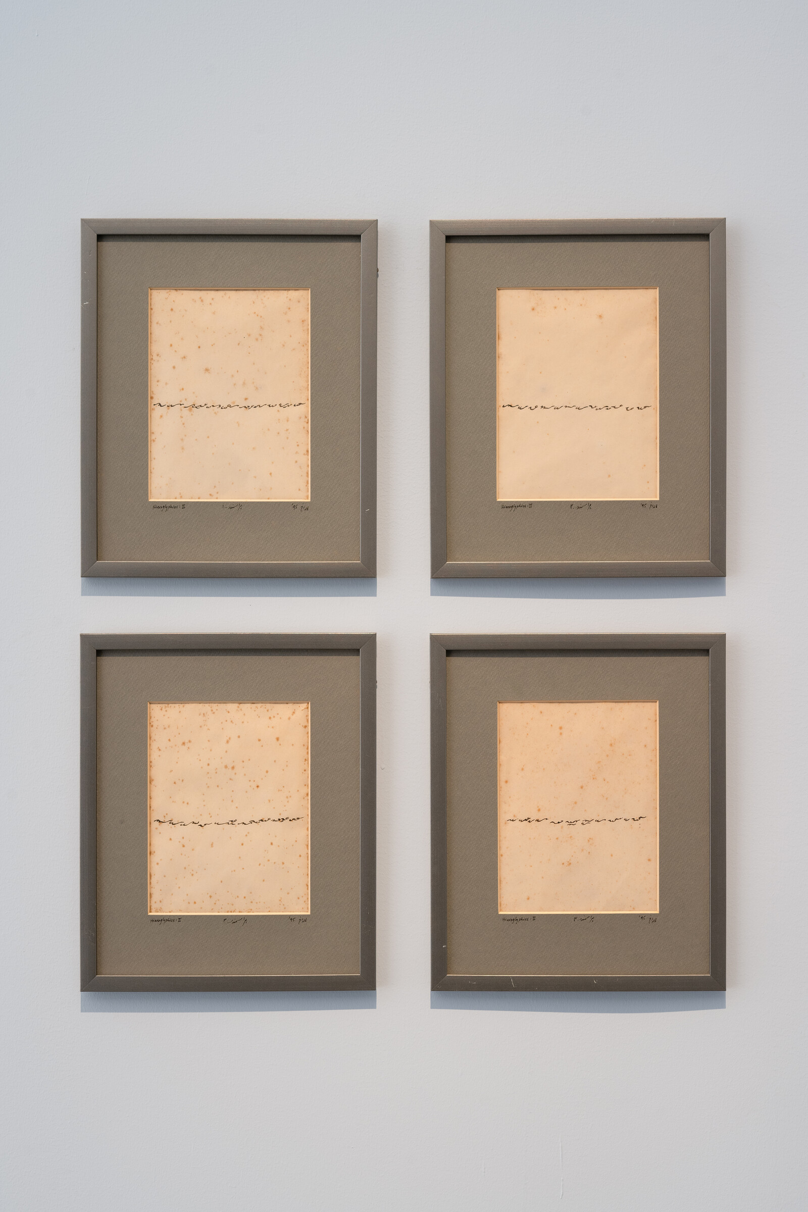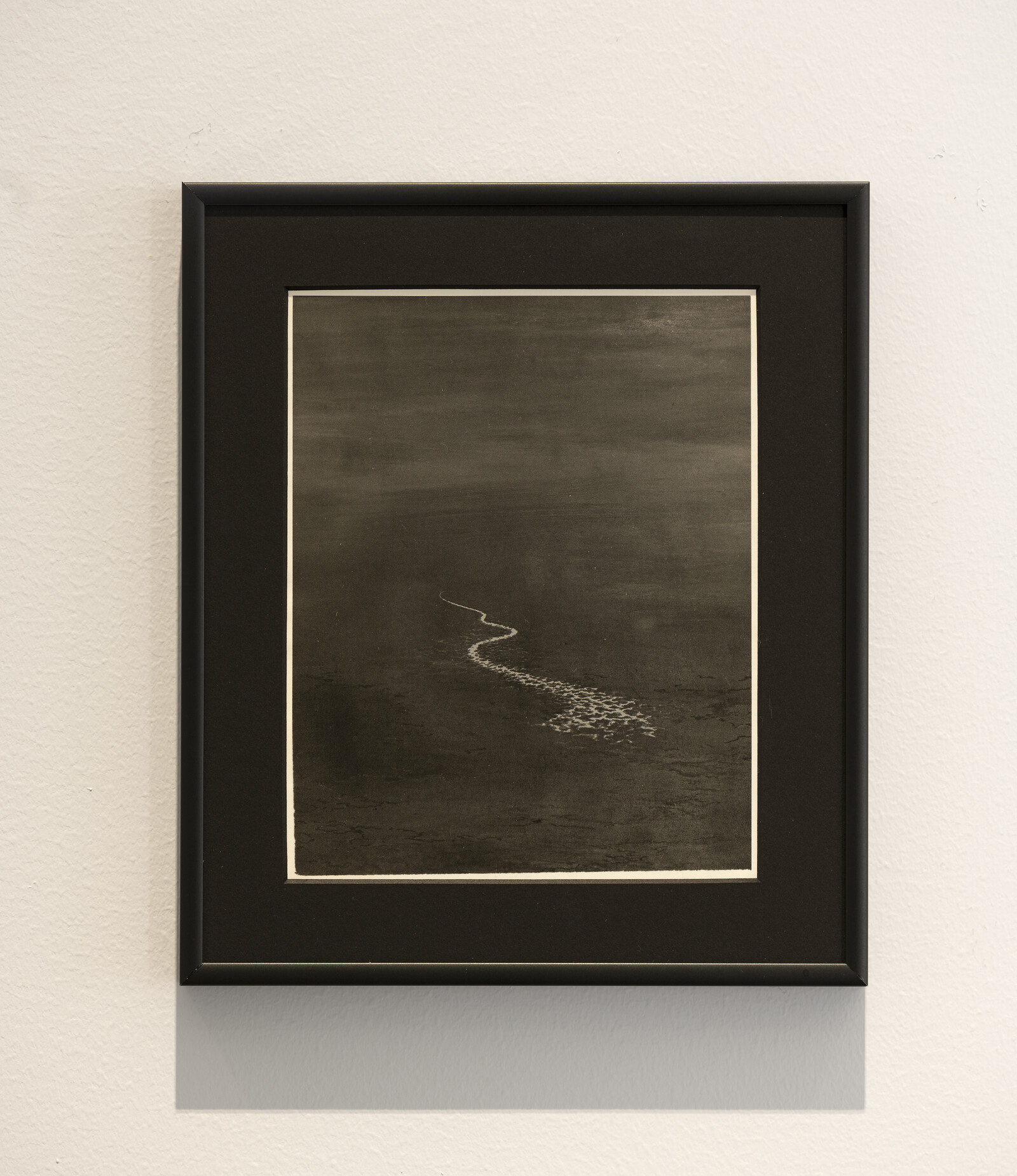 The exhibition concludes with Lala’s masterpiece Rupak (2016), a stop-motion animation based on the eponymous seven-beat raag played on tabla that was commissioned for Documenta 14 and completed the year before her passing. Building on Hieroglyphics IV and V, she divided the six-minute recording into equivalent sections each a few seconds long which she then meticulously notated as a series of drawings. These eighty-eight drawings, which are the basis for the animation, lean on a narrow ledge running along the curved perimeter of the darkened gallery, while the video plays within a diaphanous pavilion at its center, its percussive beats saturating the space around it. As the white qat repeatedly pings across the video’s black frame, variations in height capture shifts in tone and volume and quickfire polyrhythmic passages appear as rows or clusters. Music becomes the pulse of life, an antidote to the abstracted grief of Heartscape (1997), a deeply personal work that paired an electrocardiogram of the artist’s mother’s failing heart with a darkening progression of exposed photographic paper. Rupak is mesmerizing and meditative and, like the music that inspired it, is a mood and a reverie, like watching sunlight shimmering on the surface of water. It reveals a structure that is both progressive and recursive, repetitive but variable, much like waves crashing onshore. The series of subtly tinted photographs, prints, drawings, and a video of shorelines and water bodies, of sea foam in tidal pools and lines etched in coastal sands—shot by Lala over many years during conferences, workshops, and residencies across South Asia and beyond—that lead into Rupak seem to prime you for this revelation.