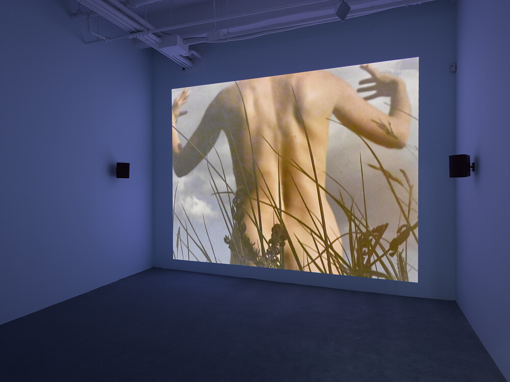 This is in contrast with the pale blue walls and neatly carpeted floor of the space containing the projected Monteverdi ici (2018). It features a naked woman outdoors with her back to the camera (more buttocks) making gentle movements with her arms. Flowers appear in this video as well, although this time they aren’t eroticized, and it ends with footage of a small child on a swing—perhaps the offspring of Into All That Is Here. Monteverdi ici moves away from the earlier video’s hetero-genital focus to return to the skin’s surface, with its long shot of the woman from behind. It also confirms a maternal element within the exhibition’s mix of female figures. Together, the two videos track a different trajectory than the travel agency’s fantastical journeys, while sharing their fragmenting approach to the female body.