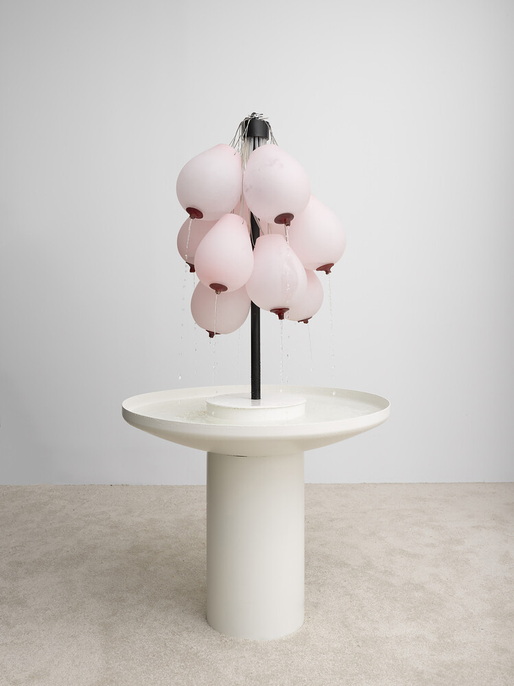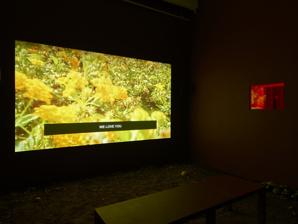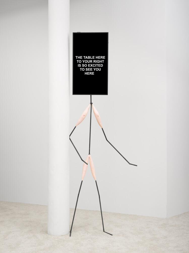 One of the exhibition’s central pieces consists of a cluster of blown-glass pink breasts with red nipples that stream water into a basin in which small goldfish swim and two smartphones are sunk (We Will Feed You, Cooling Fountain [For Global Warming], 2018). More discreet breasts are attached to the metal stick figures with flat-screen heads sitting behind two of the travel agency workstations. “We can take you to different places,” utters one of these screens in a female voice, signaling the metaphoric intent of Prouvost’s vision. The tension is between staying on the surface and going deeper. There are numerous small details for the patient viewer to discover and plenty to be read on screens and more traditional materials: “IDEALLY HERE BE SOME STAIRS TO GET HIGHER” proclaim white letters on a black wood panel titled after its text (2016). This dynamic between surface and depth is best represented by the two video installations. Overtly Freudian in referencing her grandfather’s tunnel, Into All That Is Here (2015) features footage of moving through dirt and soil accompanied by audio urging “dig deeper” before bursting into a sunny montage of flowers shot close-up to resemble female genitalia that in a few instances bees come to visit. The floor of the back gallery space housing this projected video is covered in soil, which may feel fecund, dirty, or something else, depending on one’s response to the work’s sexualized imagery.