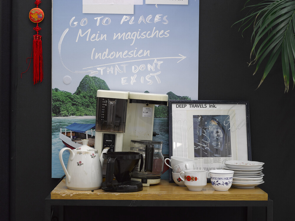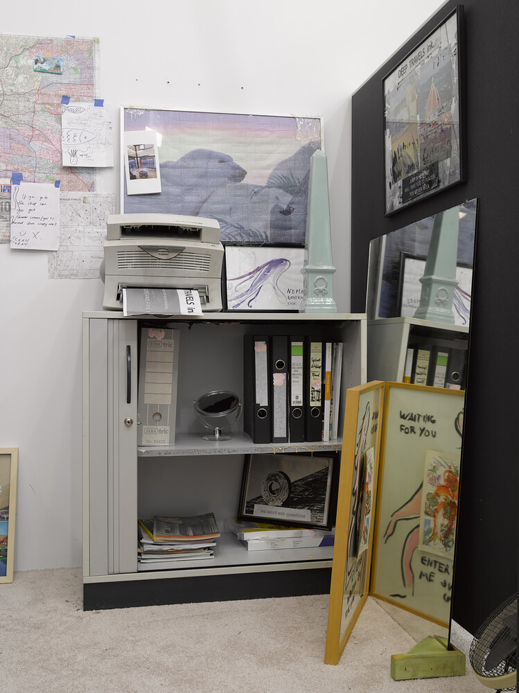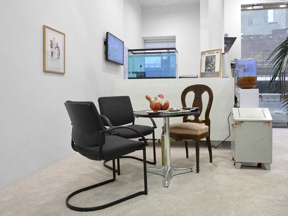 Eager to see the art in Laure Prouvost’s first solo exhibition at Lisson Gallery in New York, visitors might breeze through its central installation: Uncle’s Travel Agency Franchise, Deep Travel Ink. NYC (2016–18). Situated at the entrance to the gallery, it looks like an unkempt and outdated version of an art gallery’s normally pristine front desk featuring a guest book, a stack of press releases, and a 3-ring binder containing an artist’s curriculum vitae and relevant press materials. Instead, Prouvost has surrounded the gallery attendant with promotional airline posters, maps, a bookshelf lined with travel guides, a coat rack and umbrella stand, an outmoded printer, a dirty water cooler, and even the requisite framed family photo on the desk. To the right of this configuration is a table with two chairs and a ceramic teapot in the shape of a pair of buttocks that is the first explicit clue to the whimsy and weirdness of Prouvost’s art.