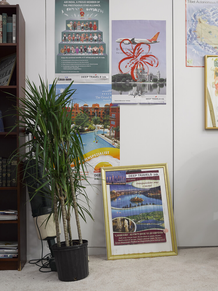 The exhibition’s conceit is that all the work on display—including installation, sculpture, painting, textile, and video—is connected to this travel agency. Three other workstations feature stacks of plane-ticket receipts and travel magazines with the company name, “Deep Travel Ink,” printed on white labels affixed to their front covers. (Born in France, but currently living in London and Antwerp, Prouvost’s work revels in these kinds of puns and misspellings in English.) But in fact some of these pieces have been repurposed for the exhibition: one of the workstations is from 2012, and Uncle’s Travel Agency Franchise had a previous iteration at Museum für Moderne Kunst in Frankfurt am Main in 2016. While everything aims to fit within the rubric of a fictional office catering more to the imagination than actual destinations, at times the exhibition feels like a conglomeration of mini installations.