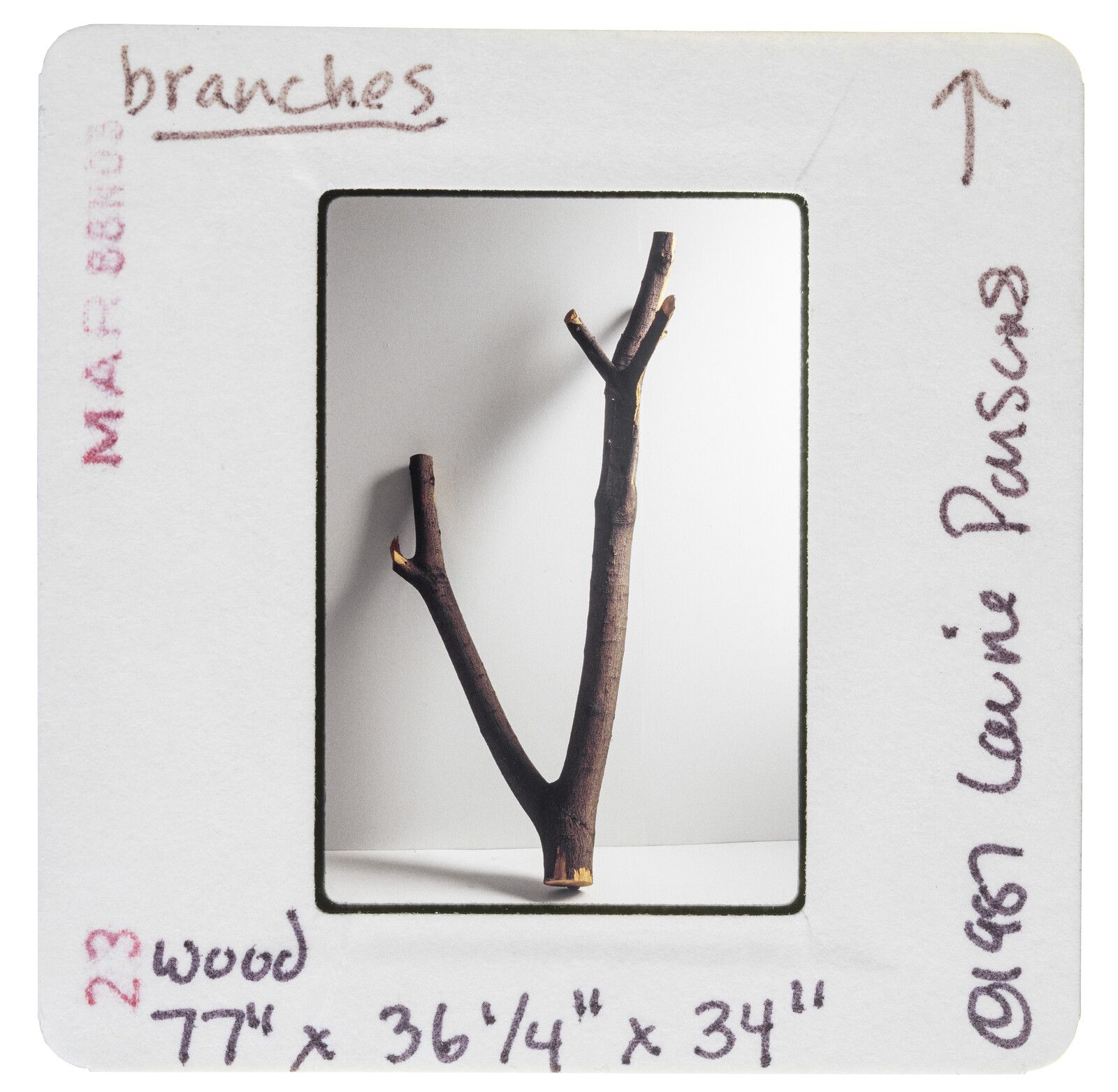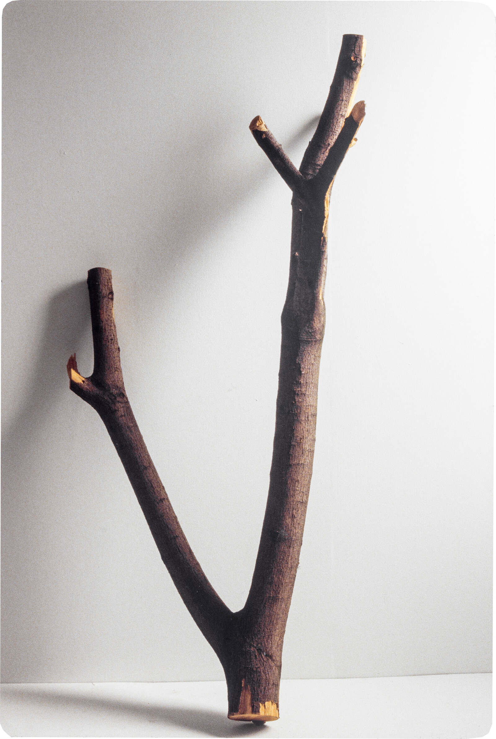 The objects were first exhibited in the artist’s first solo show, in 1988, at Lorence-Monk Gallery in New York, and again the following year at Cologne’s Galerie Rolf Ricke, after which they were purchased by a private collector. This exhibition marks their first public display since 1989. As with any historical re-enactment, things have changed. There are 28 pieces here instead of the original 29, because one scrap of woody debris was lost over the years. While the two original exhibitions were untitled, this one is titled with a phrase drawn from a certificate in which the artist referred to the objects as “twenty-nine pieces that together comprise a body of work.”2 There is also the sense that as the objects have become older and more fragile, they have accrued a new preciousness. When Parsons first showed them, they had recently been out on the street, worthless and unnoticed; looking at them today means looking at things that have been bought, sold, stored, transported, negotiated over, written about, documented, and otherwise tended to for over three decades.