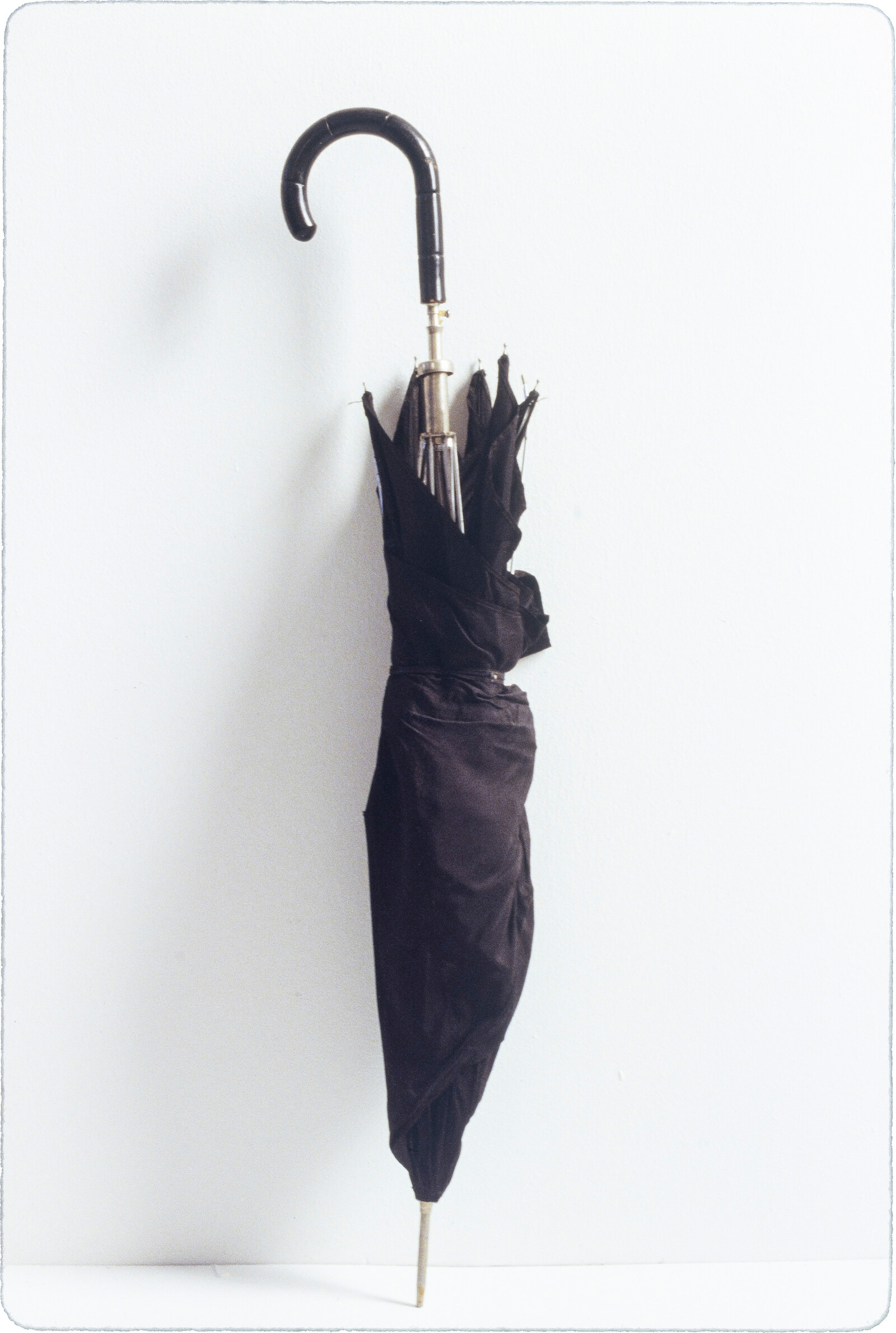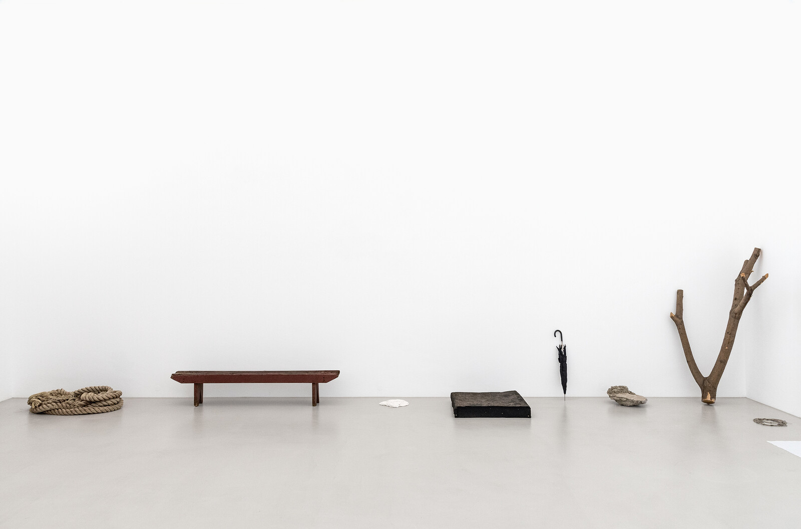 “A Body of Work 1987” presents a collection of objects that Parsons picked up from the streets around her New Jersey studio in 1987, including an old suitcase, a bicycle seat, a bunch of twigs tied together, a broken umbrella, an unearthed tree stump, some stones, a pile of charcoal, a bundle of rope, and a dirty, cracked bucket. They’re lined up around the edges of the room, more or less evenly spaced. With the exception of the wall-mounted bike seat, the objects are propped up against the wall or lying directly on the floor. There’s an atmosphere of casualness that approaches nonchalance, but it’s shot through with high-drama gravitas.