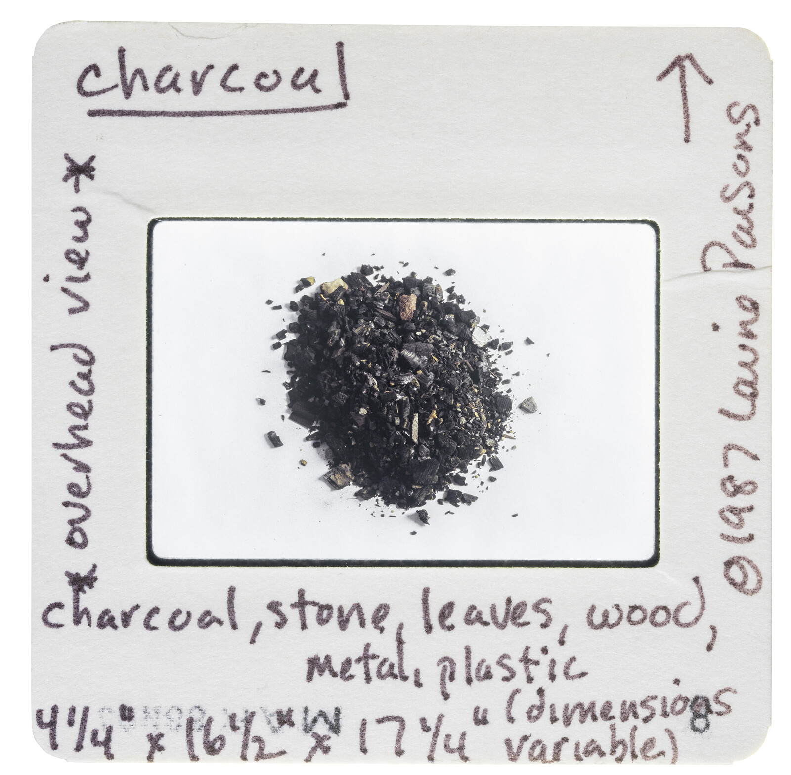 Parsons, whose art career began with sorted garbage, is part of a lineage of artists whose work was once mistaken for worthless trash and thrown away: apparently, a well-meaning worker at a storage facility binned the rubble that the artist had collected for her work Field of Rubble (1988). She is also one of a number of artists remembered for having ghosted the art world. She started exhibiting in the mid 1980s, and less than a decade later (in what can be read as another act of scrutiny) she withdrew to do social work instead. Today, she mostly works as a service provider and advocate for people without homes and people with mental illnesses in and around New York City.
