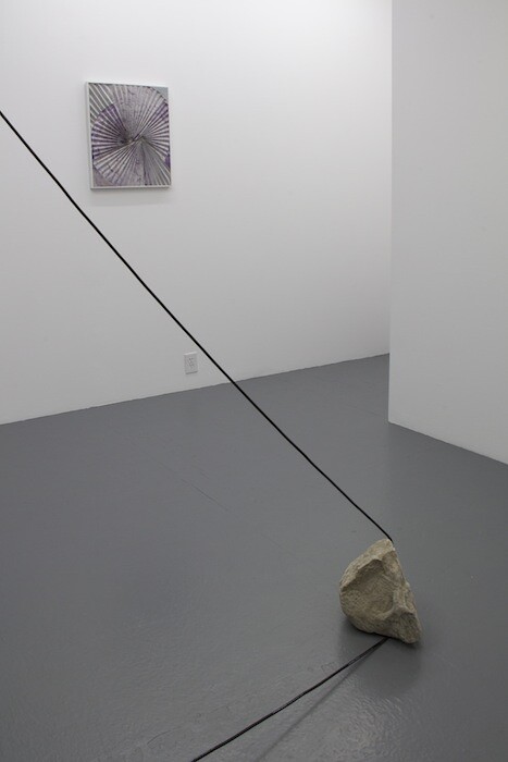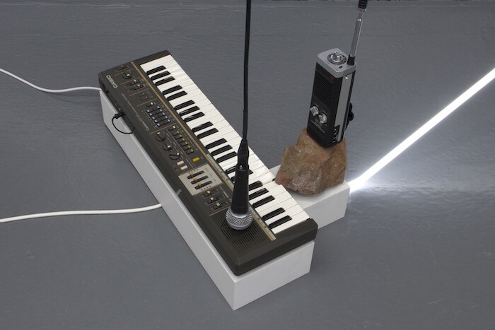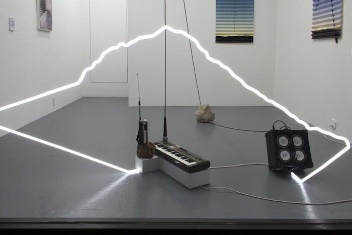 A glowing white neon tube rises from a bass amplifier, draws the stark outline of a mountain across the gallery window, and returns into a pedestal holding a walkie-talkie balanced on an unremarkable rock that depresses an “A” note on a Casiotone keyboard. A similar, slightly larger rock several feet away is bounded by a thick black cord that stretches up to the ceiling and then hangs down, weighted by an inverted microphone. The rocks, collected in Nevada, connect the mechanical sculpture to the natural environment. The subtle sound enveloping the small room is created by using effects to alter both the note emanating from the keyboard and ambient noise picked up by the microphone (including from the neon in the sculpture and the gallery’s fluorescent lights), combined with a recording of the artist’s voice made in the desert. This lonesome, almost plaintive, tone represents a human presence in the midst of outdated technology and primitive natural forms. Walker has spoken of his interest in the romantic sublime, and with this work, humanity becomes overwhelmed by the grandeur of nature, expressed through machines that reveal their own functions. The crude inner workings of the sound element remind the viewer of the inadequacies of manmade technology in relation to the processes of the earth itself.