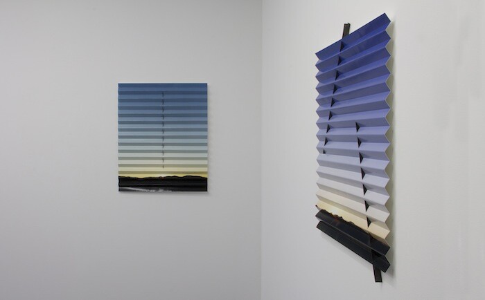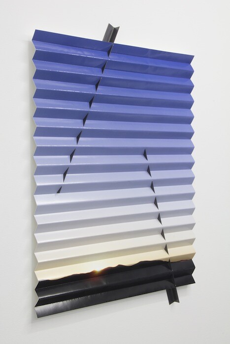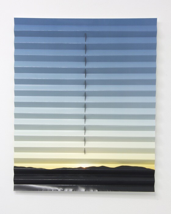 On the walls hang Letha Wilson’s Nevada Sunrise Wall Sundial (One Line) (2015) and Nevada Sunrise Wall Sundial (Two Lines) (2015), hand-pleated photographs of the sun coming up over the silhouette of a mountain range, soft yellow fading into shades of blue. Steel armatures intersect the compositions, alluding to the shadows of a sundial. Wilson references iconic photographs of the American West by artists like Ansel Adams and Carleton Watkins, eroding their hackneyed status through the addition of the mark of the artist’s hand and a harsh industrial material. The accordion folds and steel strips render the photographs three-dimensional and make evident the relationship between the artist and the environment. Like Walker’s imperfect sound recording, Wilson’s handmade folds expose the vulnerability of the individual in nature.