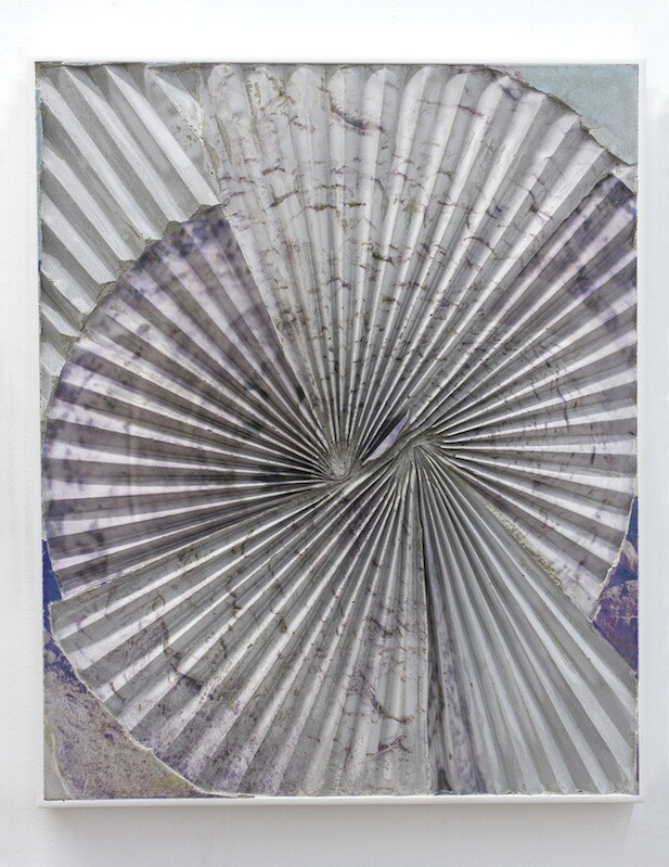 In the context of San Francisco, the third work by Wilson, Nevada Concrete Folds (2015), a cement rectangle whose pleats fan out from two slightly off-center points, resembles a much smaller, more controlled homage to Jay De Feo’s The Rose (1958–66), which originated in an apartment not two miles from Capital. The process of creation is quite different for the two works, but the end results share a similar blurring of flatness and three-dimensionality. De Feo obsessively added and subtracted thick paint to build up a rough, dense surface punctuated by a grayscale starburst in the center of an eleven-foot-tall canvas, whereas Wilson transferred a photograph of the Nevada desert onto cement and framed the 22-inch work with a neat white aluminum border. Nevada Concrete Folds shares a stark heaviness with The Rose, countered by a paradoxical fragility, hidden here in pale purple marks and delicate edges.