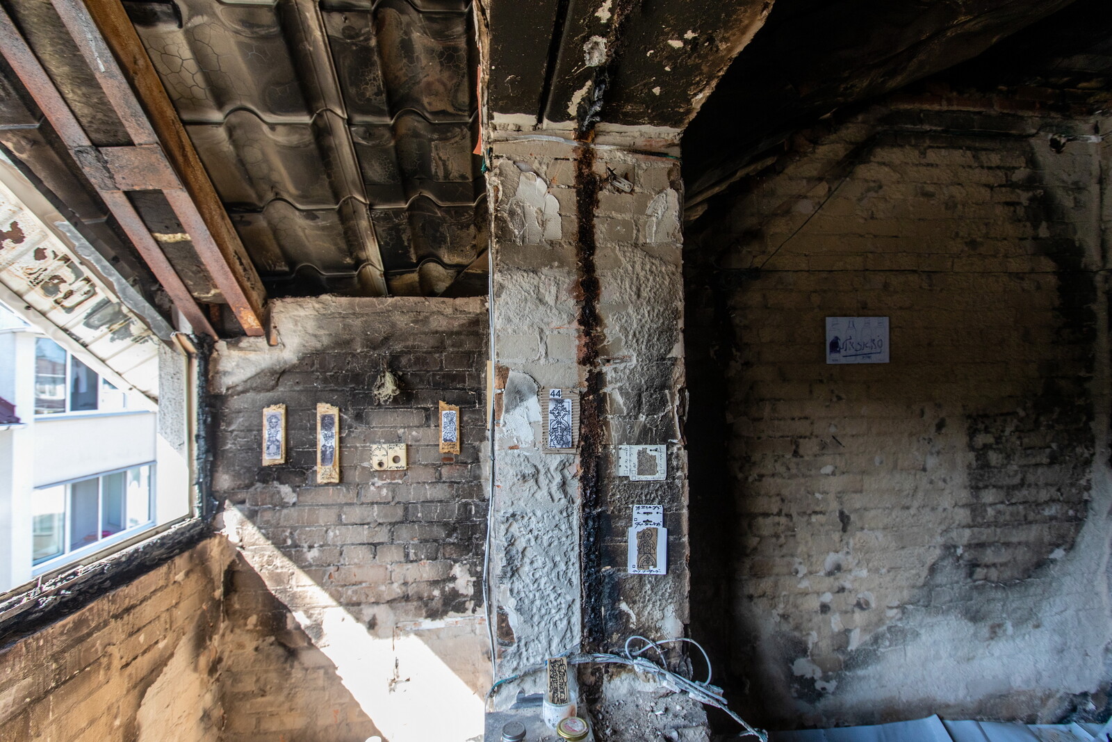 I came home for the first time for one week at the very beginning of June. I went into the apartment and saw everything with my own eyes. It didn’t look anything like what you see now in the photos. To get to the apartment, we climbed over the parapets because the collapsed roof lay directly on the stairs. Nothing remained of my furnished apartment, books, art, and vinyl records. It was all a pile of ashes, and everything fell apart as soon as I picked it up. I had the impression that I was walking through my own cemetery. Some things survived, but mostly things that were not so important to me before.