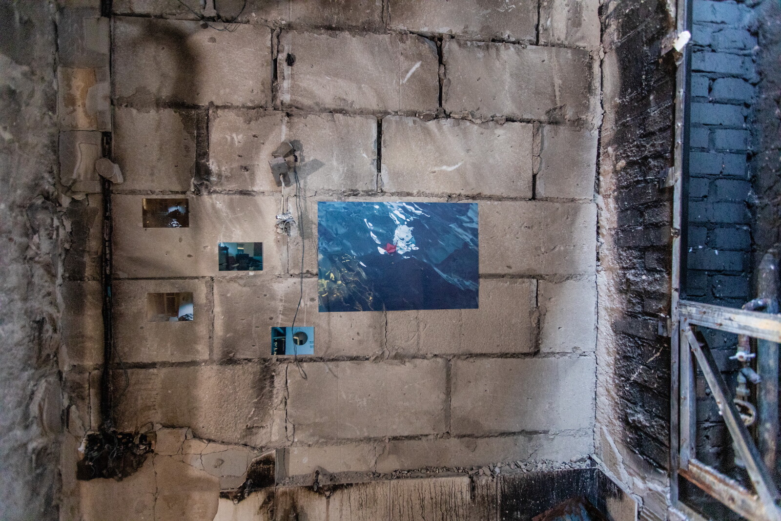On my way back to Vienna, I wrote an essay about the experience.1 I wanted to name it, unpack this ruin, at least for myself. It worked, but not completely. I wanted to talk about this experience, to see it from another side. The exhibition was another critical form. The apartment itself is already a bright visual statement. Before I arrived, our house was cleaned by volunteers from Drahobrat, one of the initiatives that help residents of the Kyiv region with destroyed homes. Therefore, when I came home the second time, the walls were empty, but this space was still filled with something difficult to name. When I thought about mounting an exhibition, I didn’t want to make it exclusively about loss and tragedy. I wanted to talk about the filled void, what loss is, and what its fate is in the future, so one of the show’s topics is life after ruin, life after death.