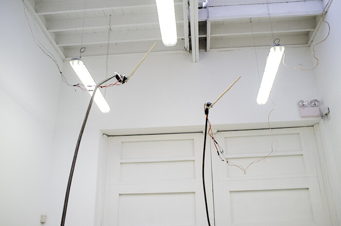 “Body Moves,” at Garúa, is named after Pamela Arce’s 2016 piece. The work consists of two spindly rebar poles fixed with tiny robots that are powered by wires spliced into the gallery’s fluorescent lights, which Arce programmed to move in random directions at irregular intervals. As the robots spin, they swing small, flat, ceramic rectangles, like mini BattleBots haphazardly fencing with tagliatelle noodles that shatter on contact.