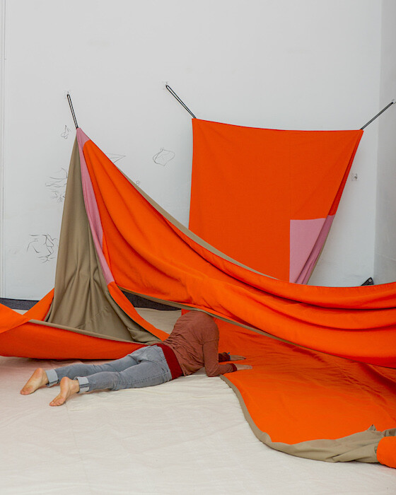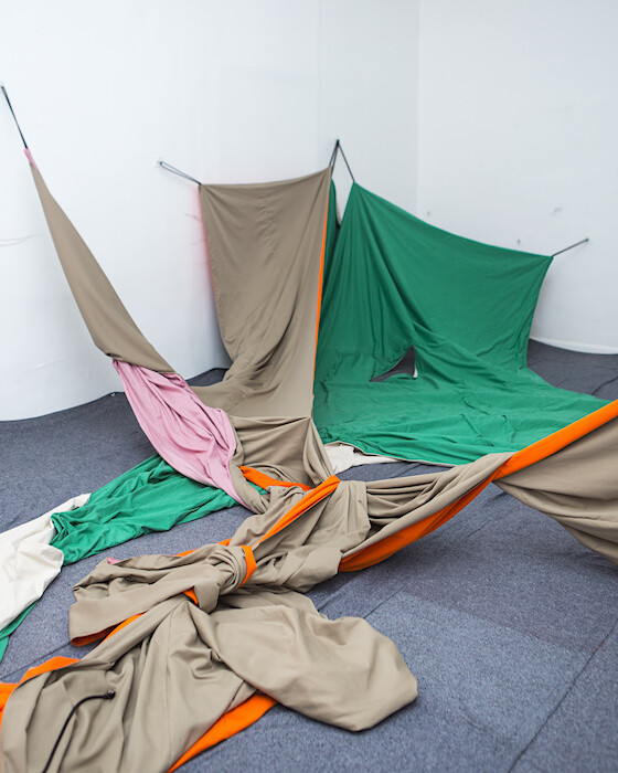 Nearby, at gallery 80m2 Livia Benavides, was “Desconocer juntos, ir a otro” (2016), a collaborative installation by Peruvian artist Rita Ponce de León and Argentine artist Tania Solomonoff, which covered the floor of the gallery with hundreds of yards of drill fabric. By forcing viewers to remove their shoes to interact with the piece, the artists cultivated an intimate experience that seemed to instinctually invoke memories of other fabric landscapes: children’s parachute games, blanket-fort sleepovers, pillow talk with lovers, and bedside goodbyes with the dying. Yet the strange shapes made with the fabric imply a brightly colored soft machine built for a mysterious purpose. As the artists’ text states, “We come from violent environments that in one way or another have given us shape.” In “Desconocer juntos, ir a otro,” Ponce de León and Solomonoff seemed to have distilled the violence and controlling forces that are part of the quotidian female experience and reinterpreted them into an immersive work that leverages aggression with intimacy.