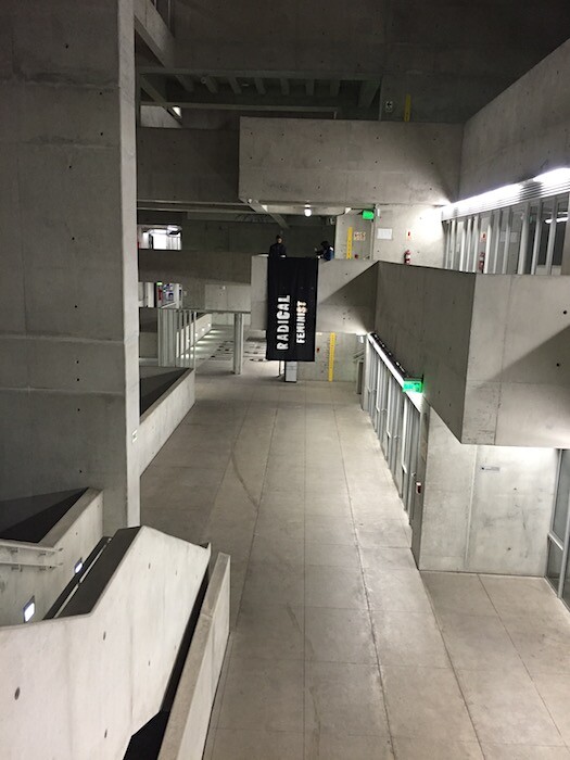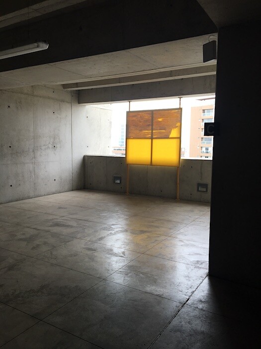 UTEC is a looming neo-brutalist concrete building perched above a steep ravine in Miraflores that leads to the sea. A frigid jumble of right angles, UTEC’s stepped design and cantilevered floors reveal cavernous volumes open to the mist as high as seven stories up. Wandering the building in pursuit of López’s works, curated by Juan Canela, feels like an intimidating sojourn into a dystopian future. In this rectilinear labyrinth that refuses color or ornamentation, López’s pieces seem to drift like ephemeral ghosts hidden in plain sight, their softness underscoring the space’s unforgiving hardness. A flag that reads “radical feminist,” Rebellion Consists Of Looking At A Rose Until Pulverising One’s Eyes (2016), luffs in the wet winter air. Damp unstretched paintings on colored fabrics sag from their pinnings. A banner installed in the university’s underground parking structure behind a parked Prius looks to sum up the strangeness of the space with a hand-painted quote from Michelangelo Antonioni’s Red Desert (1964), in which a woman wanders through an industrial landscape: “There’s something terrible with reality and I don’t know what it is.”