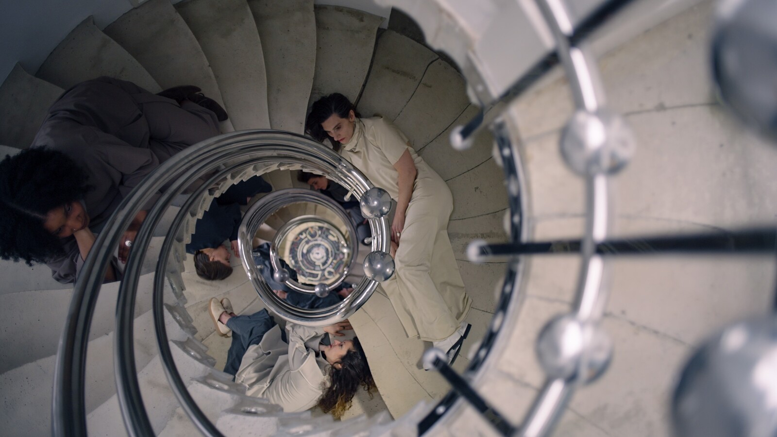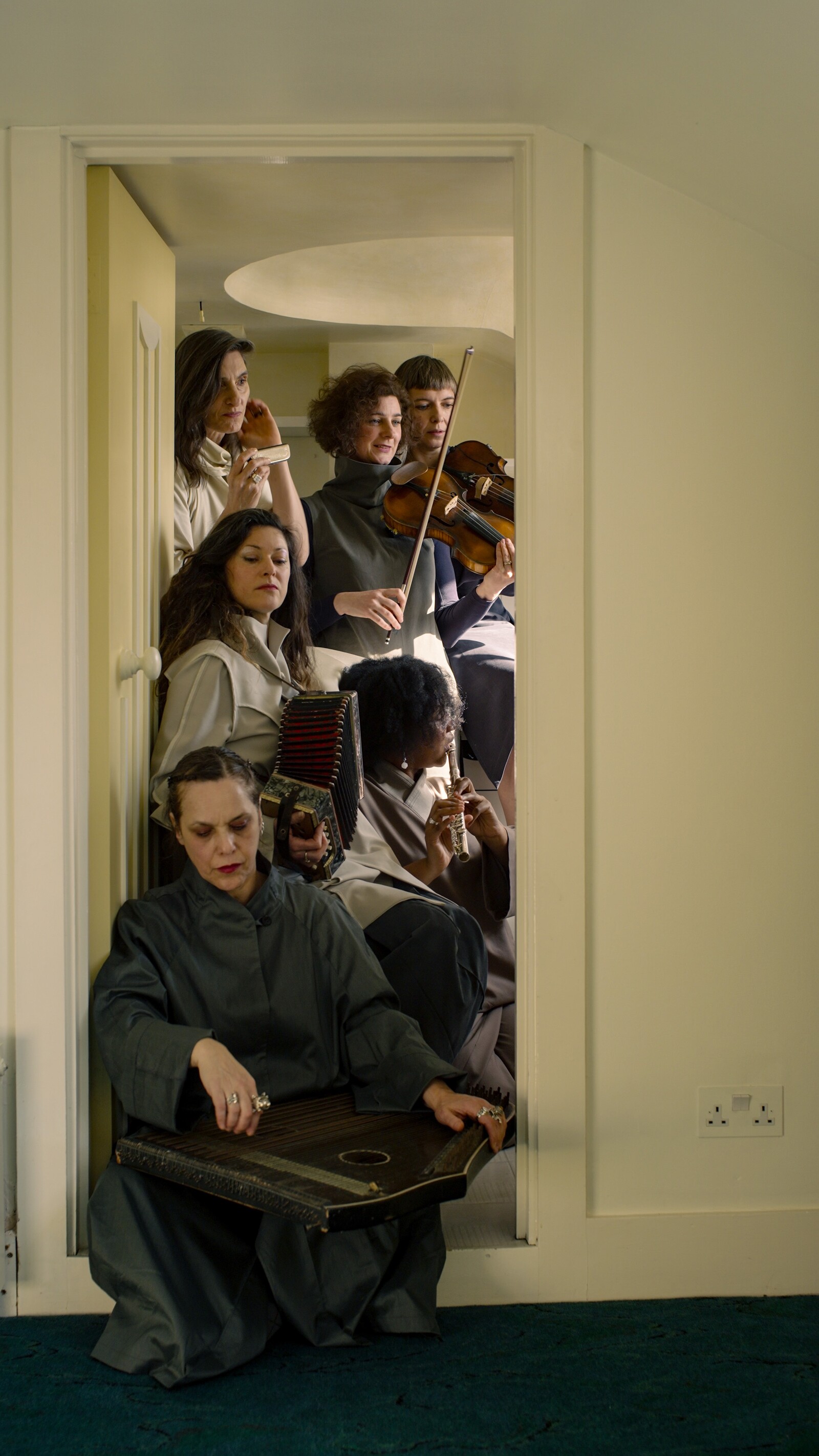 The vestibule of The Cosmic House, the postmodernist fantasia realized by Charles Jencks in a West London townhouse, is ringed by William Stok’s frieze of a symposium of thinkers ranging from Imhotep to Hannah Arendt. Such is the colossal immodesty of the architect’s project—a model of all space and time compressed into five floors linked by a helical “sun stair”—that it’s only a surprise Jencks didn’t insist on being painted into the conversation: sharing a joke, perhaps, with John Donne and the Emperor Hirohito.1 This transhistorical vision provides the unlikely inspiration for Lina Lapelytė’s intervention into this family home-cum-cosmological model, realized in collaboration with Nouria Bah, Anat Ben-David, Angharad Davies, Sharon Gal, Rebecca Horrox, and Martynas Norvaišas.