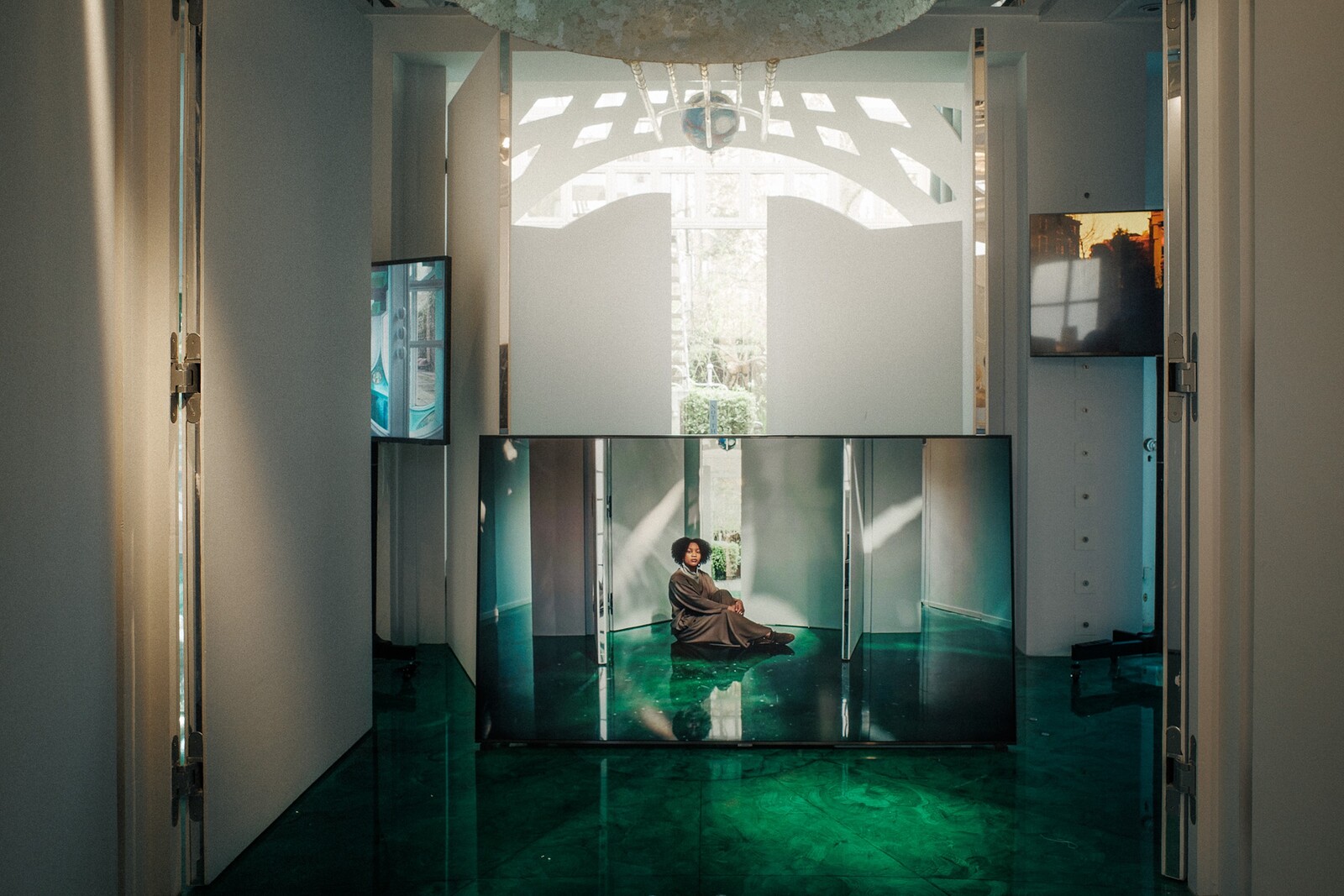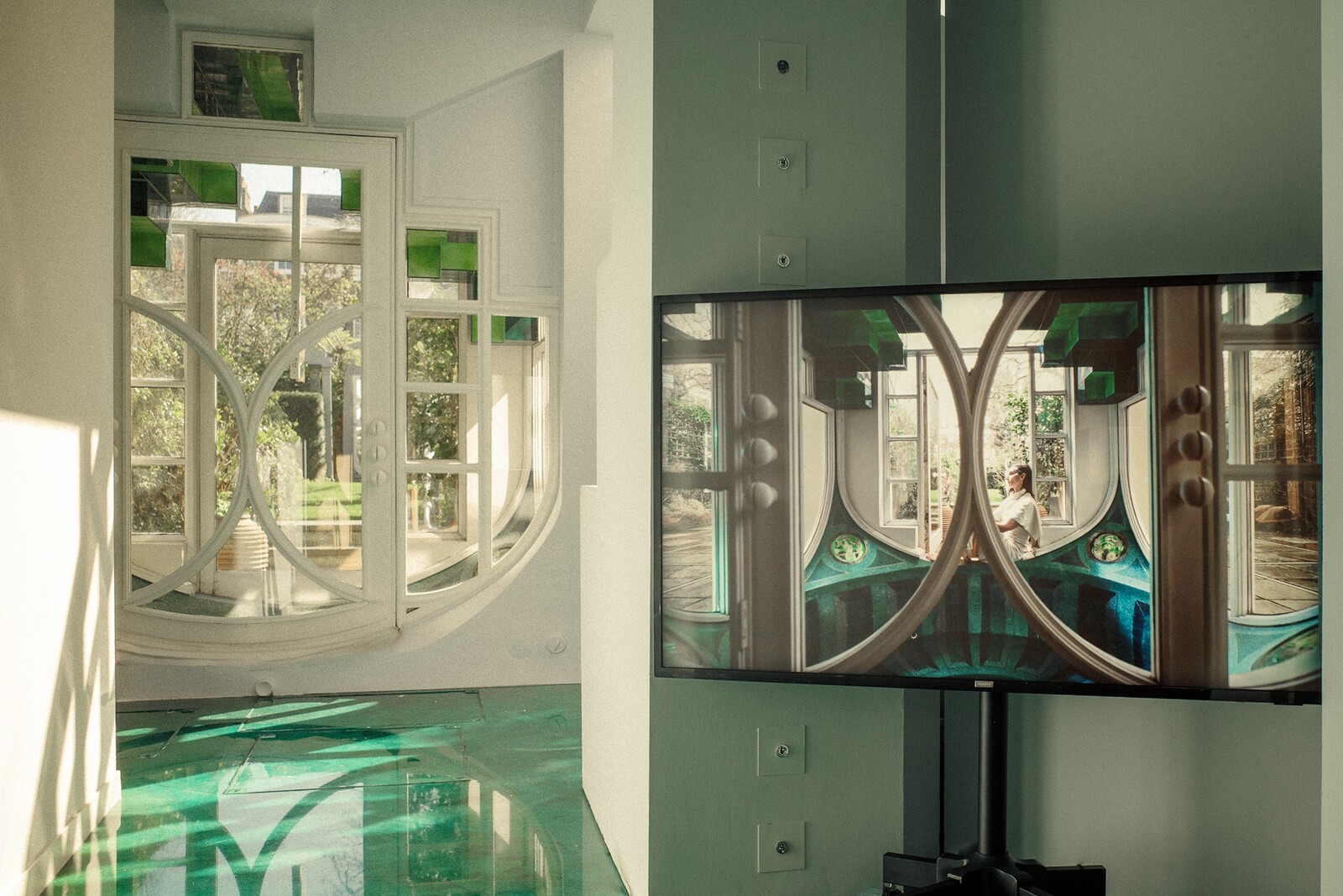 Where Jencks built an architecture that incorporates the bodies moving through it into a universal symbolic system, Lapelytė’s metaphysics has its foundation in the body and its measure in the breath. One screen tucked away in a bathroom near the entrance shows the artist, framed in a mirror and playing an accordion. She is joined by her collaborators, multiplied by the mirrors lining one of the house’s light wells, and in harmony they sing “in and out of time / the breath of six people.”2 Here solace is to be found not in the security of an encompassing infrastructure—a reassuring cosmic order, in which everything has a meaning—but in the fleeting society of voices joined in song. The music of the spheres against that produced by fragile bodies.