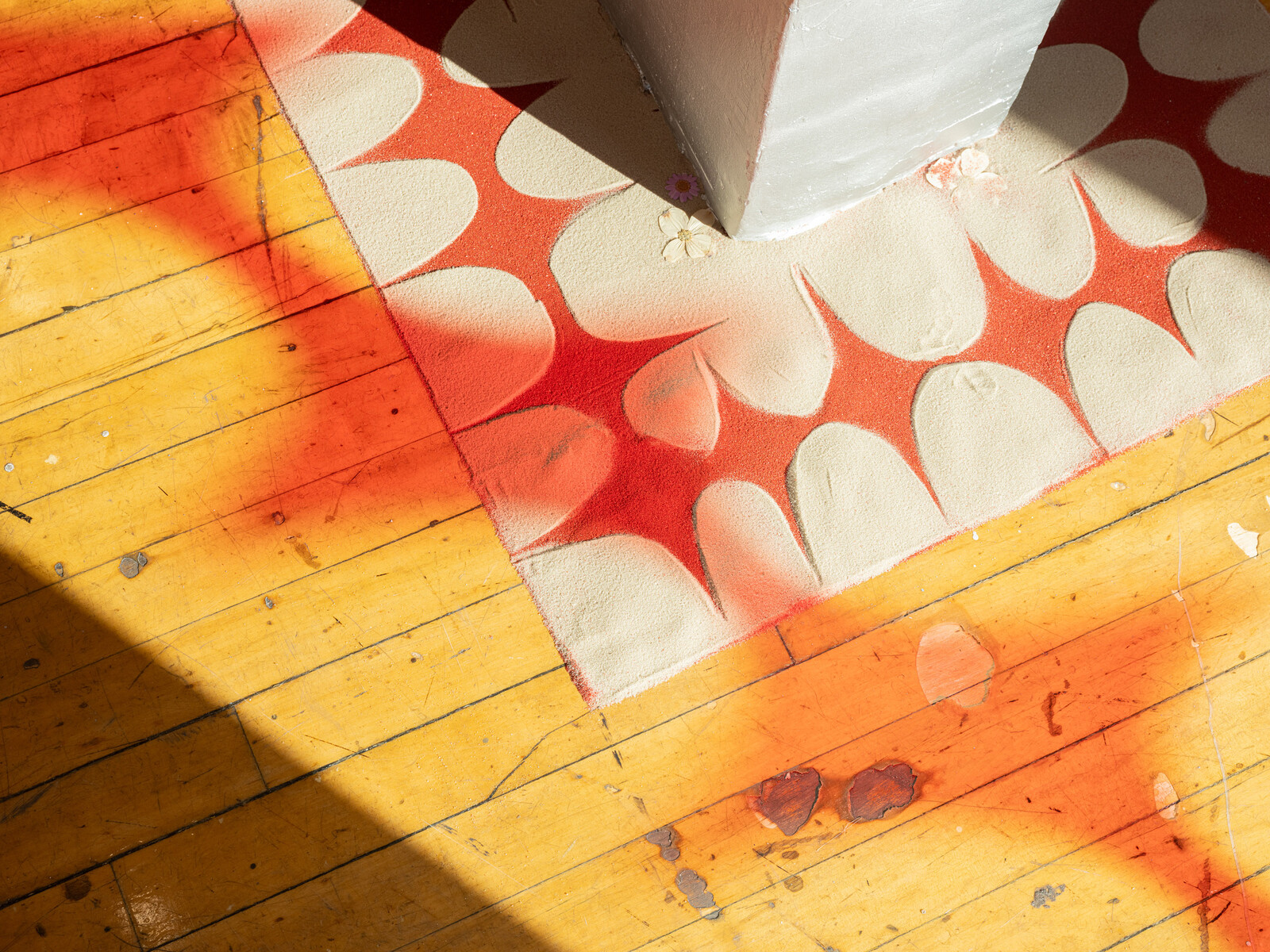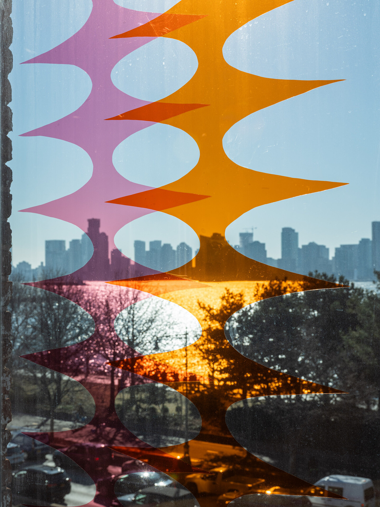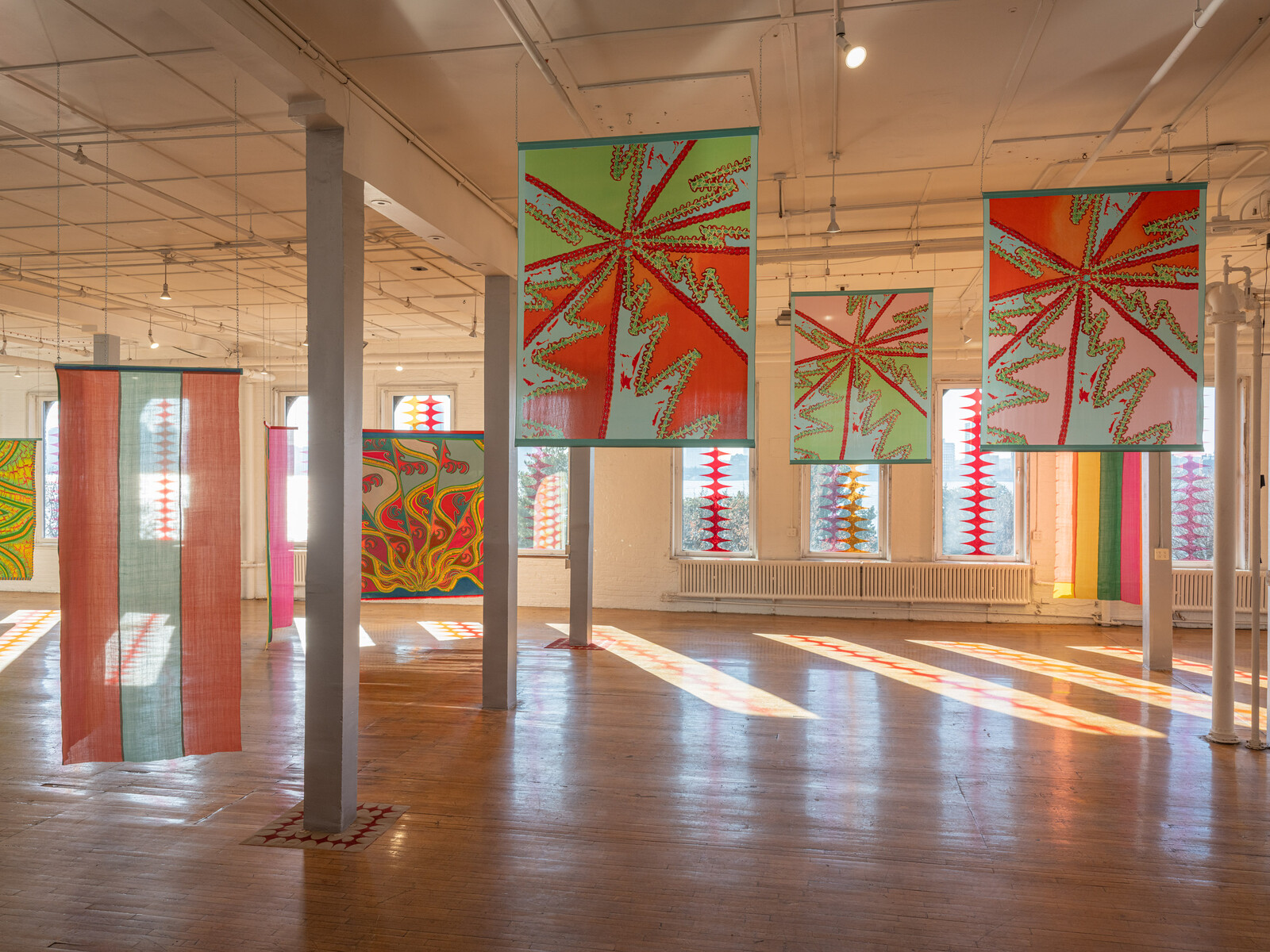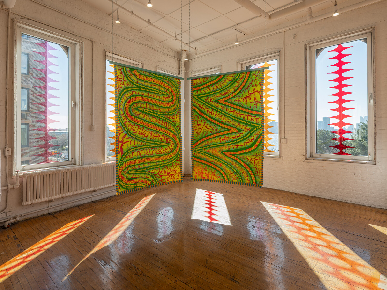 Alvarado’s paintings are visually seductive and materially intriguing, but they function best as an aggregate along with sound, natural and artificial light, and bodies moving around them. To see one in isolation would be to overemphasize abstract forms and material surfaces. Their ideal setting may in fact be what has been created at the Kitchen: surrounded by twenty south- and west-facing upper-floor windows to which Alvarado has affixed wavy, columnal burgundy gels, with afternoon and sunset light filtering through the paintings and textiles, two strings of bells tinkle, a site-specific sound piece plays on speakers, colors and configurations shift as viewers walk through the space, and various inner and outer worlds mingle.