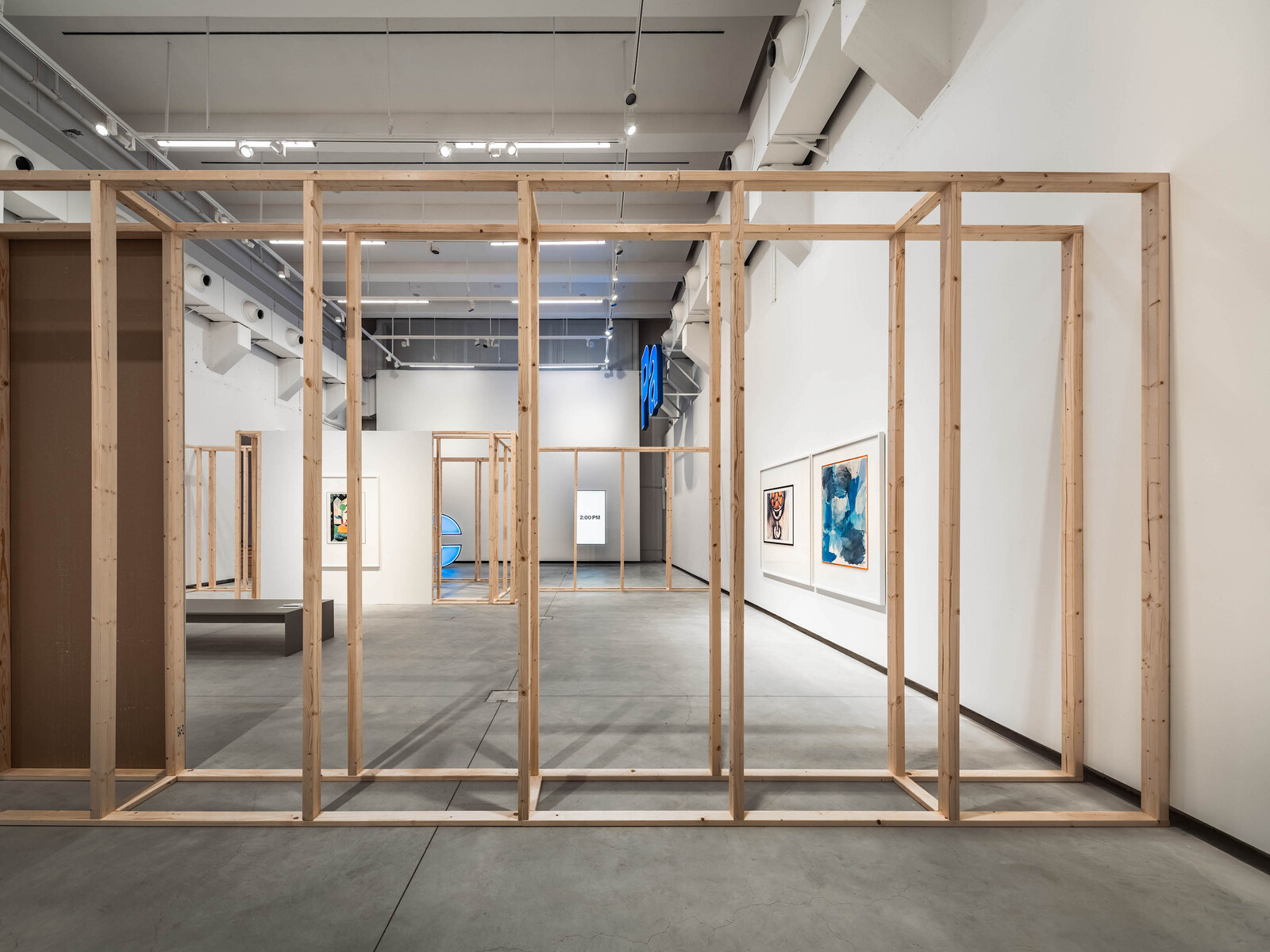 Tan treats Sacks’s diagram as a tool, scaling it up to a dizzying and dysfunctional domestic space by way of partial walls which operate as spatial dividers, passages, atmospheric zones, and display environments. Rhythmic and austere, this site-specific installation of previous works lays bare the delicate negotiation between control and collapse on which our lives depend. As an organizing principle, Promise or Threat (2023) reveals how rooms are diagrams that shape the ways in which we interface with the world. We move like ghosts, seen and unseen, between spaces that give form to the inner self: the anxiety of a family dinner, the pressure of a deadline, the monotony of a commute. Despite its systemized order, Tan’s installation succeeds in situating a vague, unsettling doubt in the visitor’s own sense of self.