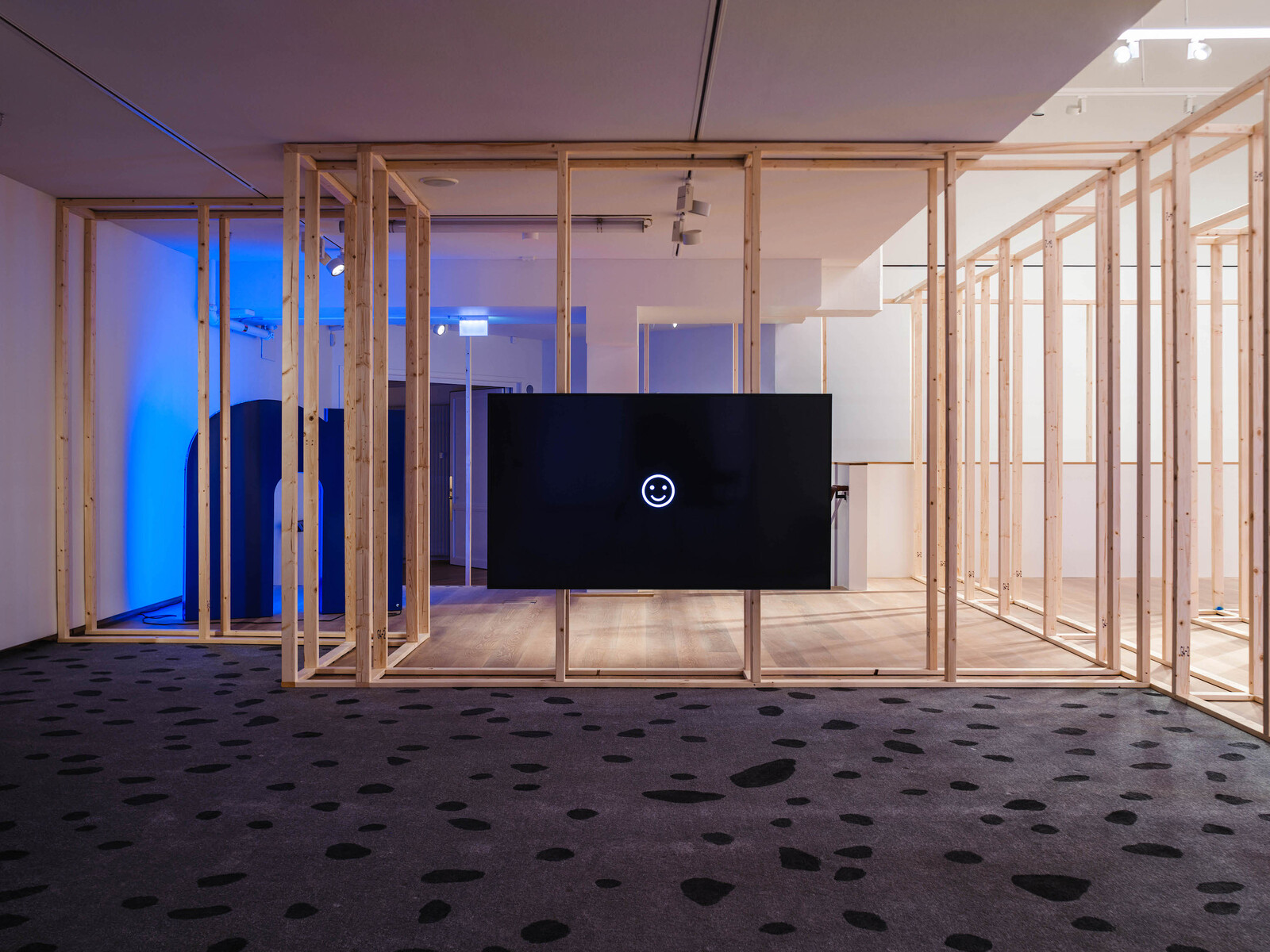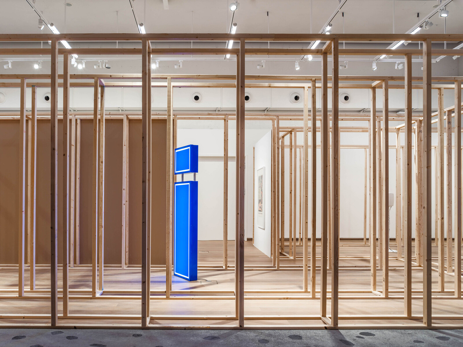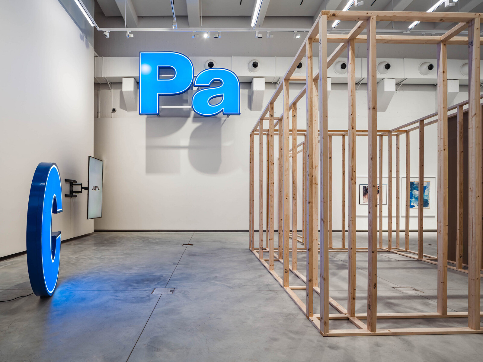 Placed through the exhibition is the multi-part sculpture Pa (2023): totemic light boxes that emit a thin blue light and reference a multinational electronics company. Illuminating the oak floors and white walls, and visible at every turn, the sculpture lifts a form of applied commercial decoration—a “roadside duck,” in the words of Venturi and Scott Brown—and strips it of its value.1 (In a subliminal desire to unjumble the characters that make up the sculpture, the word “Pa-n-i-c” comes to mind.) Citing one of the only “billboards” in the city, it speaks to a Stockholmer with a splintered sense of déjà vu: in 2009, the Swedish artist Anna Odell staged a psychological breakdown, psychosis, and suicide attempt on a busy bridge beneath this billboard.2 She was taken to a psychological care ward and sedated before declaring the next day that it was her graduation work for the university where Tan is now a professor.3