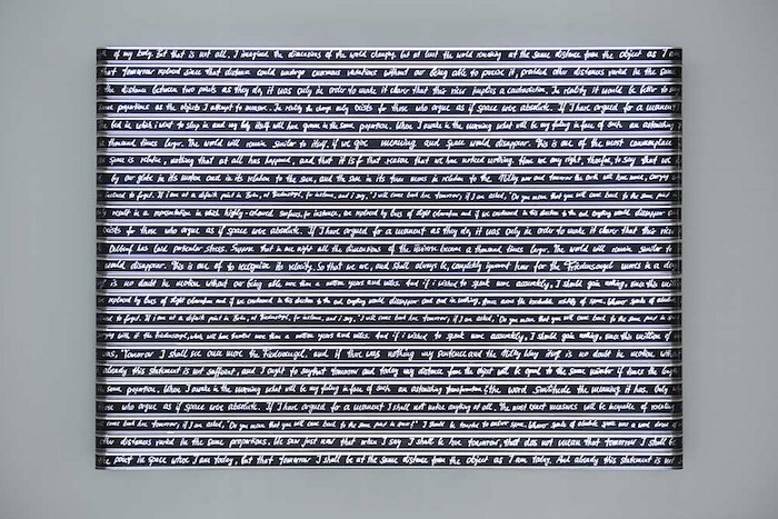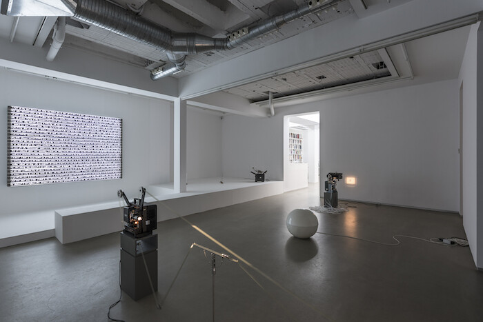 The history of art, and the structures underlying its production, are inescapable at Rosa Barba’s “Thoughts of Sorts” at Parra & Romero, Madrid (February 25–April 23, 2016). The exhibition space is cluttered with antiquated, rattling projectors and webbed spools of celluloid film; visitors are endlessly stepping over wires, skirting around projected lights, worrying that a loose scarf might scrag on a length of magnetic tape stretched precariously across the floor between distant loops and bobbins. At the center of the floor squats a fleshy white egg whose surface seems to liquefy and ripple as the subwoofer within it beats a deep, low pulse. Where Iman Issa’s Lisbon show was defined by the separation of the image from the context of its production—the wires tucked discreetly behind walls much as the links between memory fragments were withheld from the viewer—Barba places the mechanics of film-making and memory at the very front and center. The show’s title takes inspiration from Georges Perec, who as a member of Oulipo sought to use the structures of language against itself, much as Barba allows viewers to see how the material means of production contribute to the content and meaning of the words, colors, and patterns that are thrown up against the gallery’s walls. “Thoughts of Sorts” suggests that if we want to change the way things are, we need first to understand the conditions that created them.