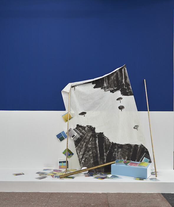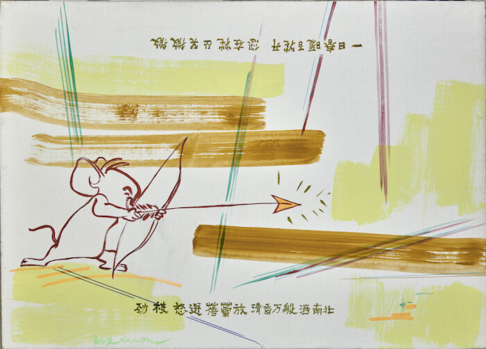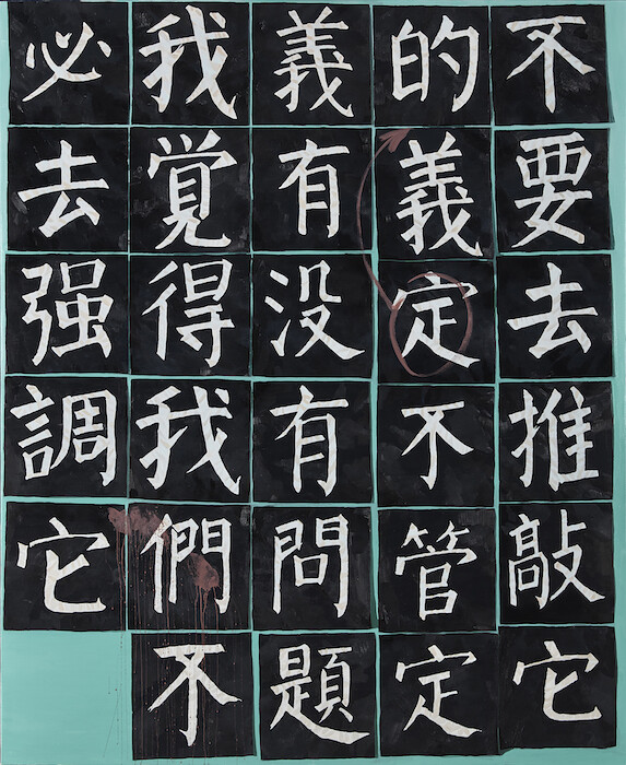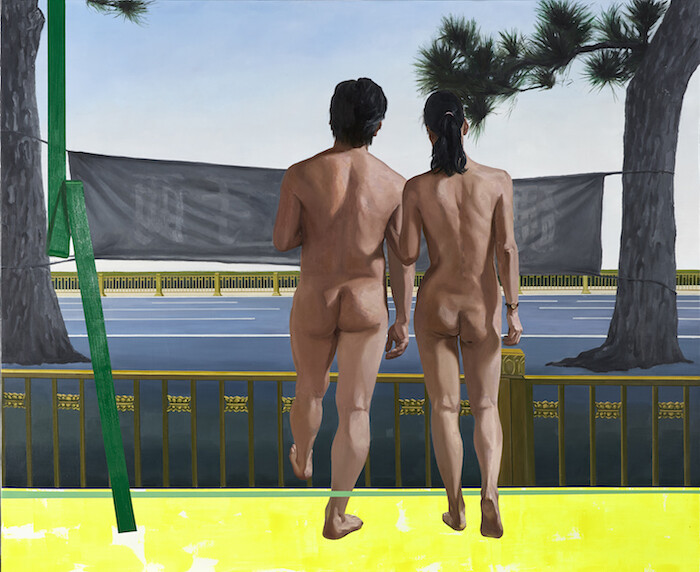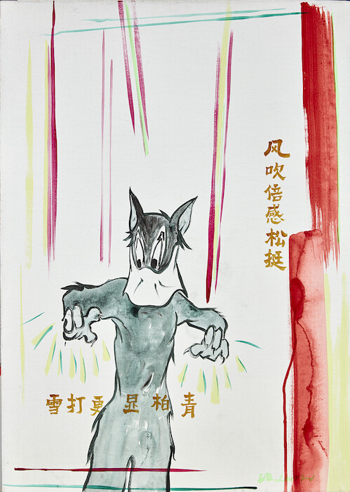 Liu Ding’s curatorial research with his collaborator and wife Carol Yinghua Lu took a new turn in 2010. Recognizing that China’s art history is often legitimated by comparison with Western art history, they decided to take a more self-reflexive approach and look at the roots of contemporary Chinese art by studying the legacy of Socialist Realism. Each of the works touches upon a sentiment that is present in Chinese society. Take the large oil painting Li Jianguo, which shows the backs of a naked, middle-aged man and woman. Either of them might be Li Jianguo, since the name is not gender-specific. They are walking towards a banner with an unreadable slogan and a golden fence of the type installed on Tiananmen Square after a man from a Uighur minority in Xinjiang province crashed his car into the Forbidden City near the portrait of Mao Zedong in October 2013. Other works link societal dynamics with what was happening in artistic circles. 1988 (Language As The Issue) (2016)—an installation in which colored booklets, a canvas, and bronze sticks seem to have fallen together—points to the aftermath of the 1985 New Art Movement, when a progressive momentum was halted by a debate between two factions within the group over language, and returned to a conservative stance. This was shortly before a crackdown on the arts, a phenomenon usually narrated through the closing of the legendary “China/Avant-Garde” exhibition held at Beijing’s China Art Gallery in February 1989. The series “Apolitical Figures” (2016), on the other hand, refers to a change in state ideology, when the Gang of Four was denounced after Mao’s death in 1976. The paintings feature cartoon characters Tom and Jerry and excerpts from the “Tiananmen Poems”—anonymous poems written at the time by demonstrators and posted in the public square—from which all terms related to commemoration and condemnation have been omitted. This act echoes the gesture of editing politicians out of state photographs after they fell out of favour, a common practice during the tumultuous Mao years.
