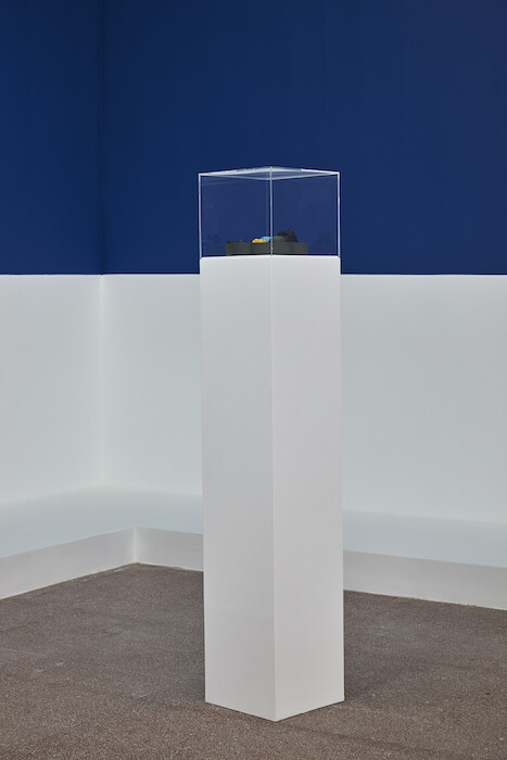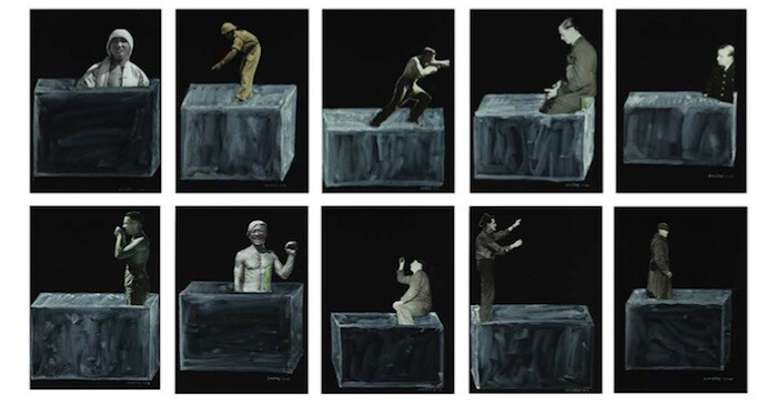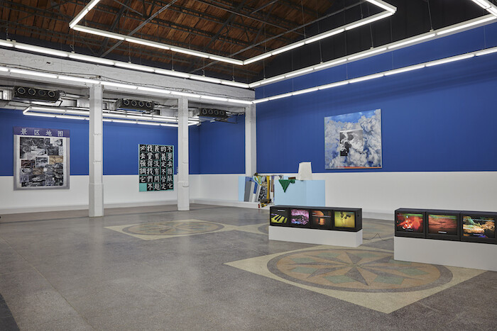 Liu Ding is both an artist and a curator. This double identity is clear from the first impressions of this exhibition, which appears as a tightly curated group show in which each work is part of a puzzle comprising the art world, state ideology, and “the West.” The walls of the gallery are divided into horizontal blue and white bands and the colorful tiles of the original floor left visible. The space is filled with more than 30 stylistically diverse selection of works; there are collaged photographs separated from their sources (Figures taken out of Context, 2015); realist, figurative paintings executed in a colorful palette (such as Li Jianguo, 2016); and two installations that look more like collections of evidence than the products of a process. All of this is orchestrated in an unorthodox and controlled architecture with plinths that are too tall for the viewer to comfortably see the sculpture it supports, and a low platform running along the wall to keep a distance between the viewer and the works, as in old-fashioned museums.