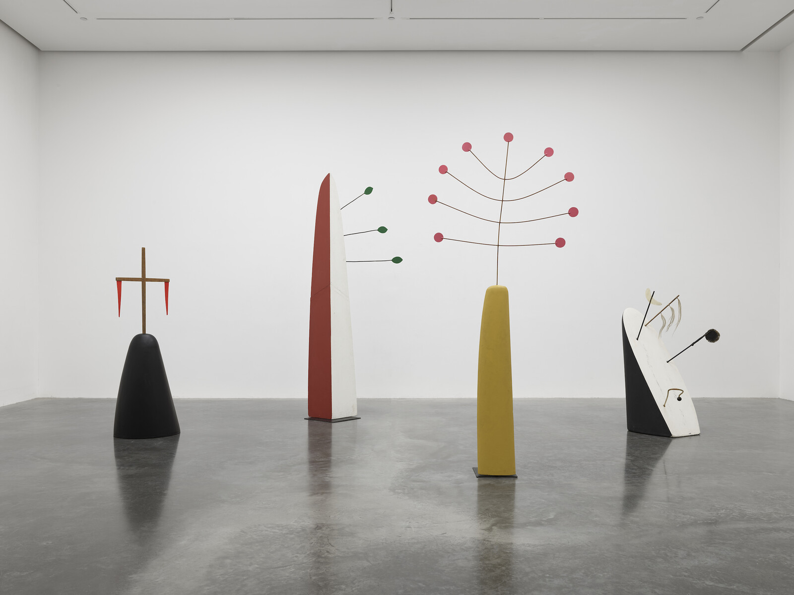 Nour Mobarak’s exhibition at Rodeo, “Gods’ Facsimiles” presents small mycelium sculptures housed in wood-and-plaster niches. They represent Apollo, Cupid, Dafne, Venus, and a chorus—collectively (when you add in the epoxy resin snake that slithers across the gallery’s floor) the cast of the opera La Dafne by Jacopo Peri and Ottavio Rinuccini. These are homages to the marble figures commissioned to stand in similar niches when the opera was first performed in Florence in 1598; much larger mycelium sculptures of the cast will be presented as part of Mobarak’s multimedia installation at the Municipal Theater of Piraeus, Greece, in July. They remind me of Bernini’s Apollo and Daphne (1622–25), and not just because of their shared subject; while Bernini makes marble seem like organic matter, Mobarak transforms organic matter into the material of sculpture. They meet in this sense of being completely alive. Also combining performance and sculpture, and also completely alive: White Cube’s show of Isamu Noguchi includes video documentation and photographs from Martha Graham’s dance Dark Meadow (1946), for which Noguchi designed the sets and costumes, with the sculptures from the set on view.