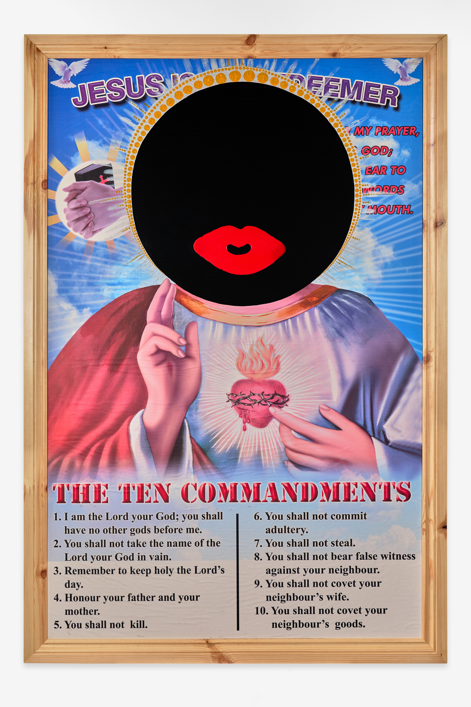 Two other shows compounded different mediums in remarkable ways: at Cabinet, Ed Atkins frames together multiple little drawings (monsters, cookie crumbs, body parts, tiny landscapes) on Post-It notes (titled Children #5, #6, #7, #8, and #9, all 2022–23) ); he also publishes two texts in the gallery pamphlet, treating it as an extension of the exhibition and a work in its own right. At Larry Achiampong’s exhibition at Copperfield, I played videogames with disturbing content: A violent Catholic pilgrimage in Blasphemous (2019); civil war between nativists and an underclass in an imagined version of the USA in BioShock Infinite (2013). The games are included as found objects alongside religious posters of the kind common in markets in Ghana. The faces in these posters have been overpainted with those of the Golliwog dolls that, as a child, Achiampong saw advertised as collectible souvenirs on the jars of a ubiquitous brand of British jam. How to look at this? The popular representation of Jesus as a white man in the posters Achiampong appropriates is the result of European missionaries spreading their religion and its white iconography; that the racist Golliwog dolls were considered acceptable as recently as the 1990s now seems incomprehensible. Just to replicate problematic images does not mean to critique them, but Achiampong’s show (titled “And I saw a new heaven”) alerts us to their strangeness and their prevalence, building a context that encourages viewers to interrogate them. This experience is enhanced by the legibly religious architecture of Copperfield, located in a building that used to house the dining hall for the church next door.