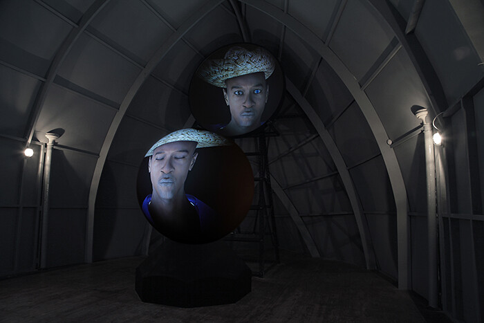 The biggest of these otherworldly media-friendly extravaganzas is “MIRRORCITY”—the zaniest and therefore the best show I’ve seen at Hayward Gallery in years. Dealing with the “digital revolution,” science fiction, and the city, the exhibition is wonderfully muddled. Phlegmatic hacks such as The Guardian’s Jonathan Jones hated it, and failed to engage with its challenges.1 “MIRRORCITY” is not a one-liner show: it stakes a claim to the muddy terrain of human experience in toto—sexuality, identity, fantasy, and geopolitics—and there are delights aplenty: a vast, upturned boat-shaped edifice, which houses a moving-image work by Lindsay Seers (Nowhere Less Now, 2014, a new version of a work first presented in 2012 as an Artangel commission); Ursula Mayer’s Medea (2013) and Gonda (2012), two sumptuous film works that dazzle the viewer with baroquely costumed transgender performers and slabs of colour; Tai Shani’s brilliantly kitsch diorama with video narration, Dark Continent (2014); and Anne Hardy’s immersive and oddly calming installation environment Two Joined Fields – Field (/\) and Field (decagon) (2013).