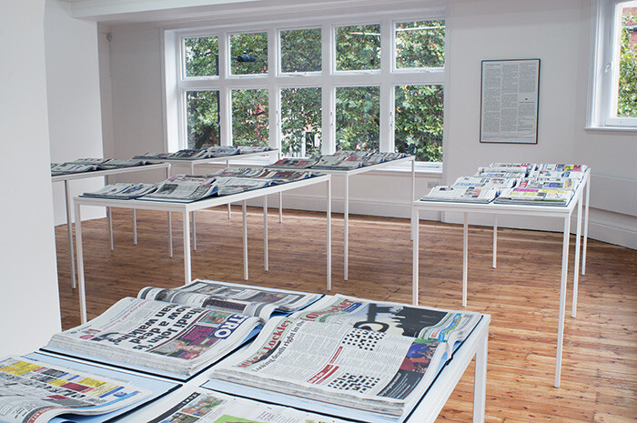 Elsewhere in town, Istanbul-based Rodeo gallery has just opened a new location on the fringes of Soho. On view in the first of the gallery’s two-floor spaces is Tamara Henderson’s What’s Up Doc? (2014), a 16mm film very loosely about tourism—or at least the old-school aesthetics of high street travel agents, with their promises of exotic adventure in Brazil or Jamaica. The film is made of a series of non-sequiturs heavily redolent of classic Surrealist film: strands of seaweed defy the forces of nature and drag themselves out of a briny shoreline (pulled by invisible string); colorful atlases are shredded into a brown pulp in a food blender; a white-gloved hand on which are marked various body parts gestures pointlessly. In the gallery’s top-floor space, Banu Cennetoğlu exhibits 04.09.2014 (2014), a vast collection of local British newspapers collected on the eponymous date—a deliberately futile attempt to archive and detail the obsessions of a nation.