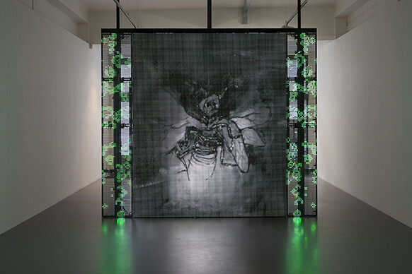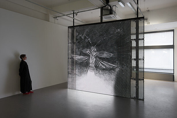Philippe Parreno, by contrast, delivers a visual punch that captures the briefest flash of time. The main work shown in his solo exhibition at Pilar Corrias—With a Rhythmic Instinction to be Able to Travel Beyond Existing Forces of Life (2014)—is a large panel of hundreds of LED lights that flash on and off, creating a retina-burning series of images of fireflies; these images are based on drawings Parreno has made of the lucciola bug over the past four years. There’s a circular logic at work here: computerized patterns of electric bulbs depicting insects that emit light. More than that, however, each flickering image (lasting only a brief moment) suggests a life that has come and gone in an instant, a potent allegory of life and death. Between the gallery space and the street, Parreno has installed One Blind Sister (2014), a mechanized roller blind that ascends and descends in reaction to noises on the street outside. It’s evidently an attempt to root the gallery experience within the fabric of the city—a noble idea, but one that felt far too gimmicky.