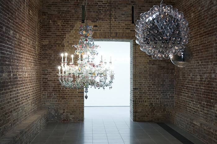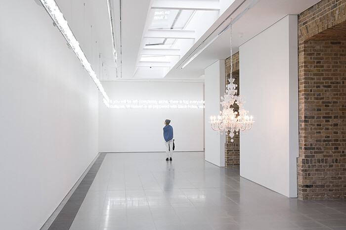 Also working with light is Cerith Wyn Evans, who is showing a group of works using neon lettering, baroque chandeliers, halogen bulbs, and heating elements at the Serpentine’s Sackler Gallery. The exhibition was not in any way surprising: at his much larger solo show in 2012 at the De La Warr Pavilion—a grand modernist building on the seafront of Bexhill-on-Sea, on the south coast of England—the seaside sun and illuminated artwork combined into a powerful, emotive encounter. The effect was less striking at the Serpentine. It was, nevertheless, salutary to see Evans’ work in the context of the other exhibitions. Evans is one of the threads that knit together current moving-image practice with the queer Conceptualism of the 1990s (Félix González-Torres, Robert Gober), and further back to the baroque New Romantic work of his early career in the 1980s. In the dazzle of these flashing lights and screen spectacles, there are identities being crystalized, smashed, and remoulded: protean, quick, and complex.