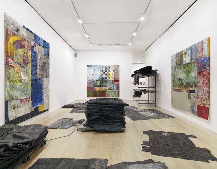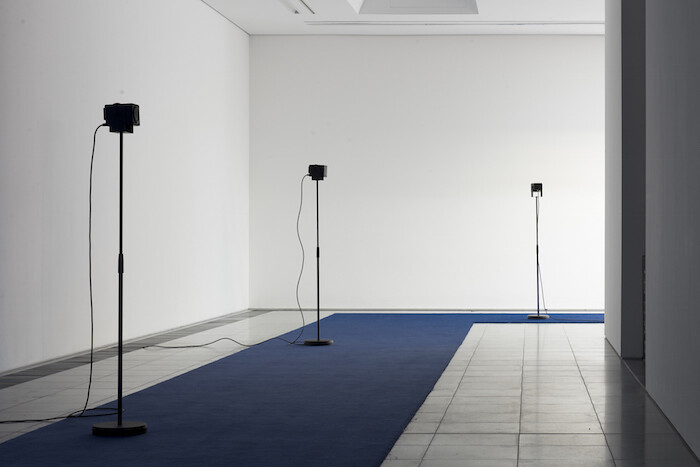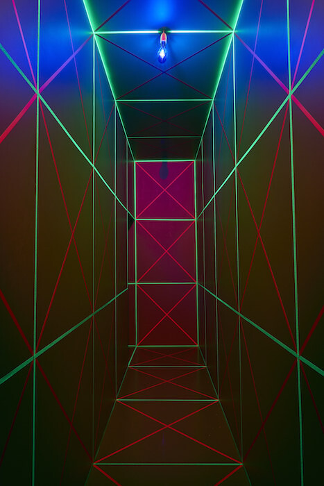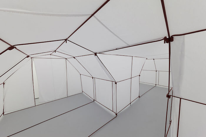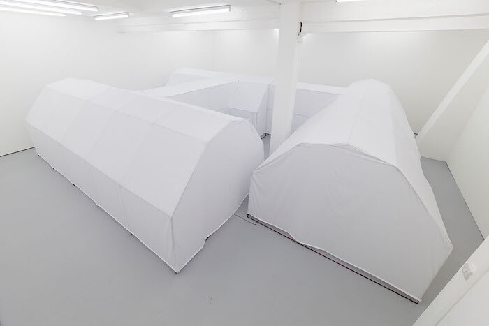 At Maureen Paley Gallery, Liam Gillick’s exhibition, “The Thought Style Meets the Thought Collective” presents a number of pieces that involve physical presence in the space, be it the viewer’s or the creator’s. A Broadcast from 1887 on the Subject of Our Time (1996) includes a radio transmitter emitting a text first published in 1888 that you need to kneel next to in order to hear clearly; the installation When Do We Need More Tractors? Five Plans (1999) seems like a collection of firewood, wall text, and a floor piece until you read the accompanying text, explaining the process of its creation, haunted by activity (“mix vodka and glitter,” “pour a liter of vodka on the floor”). Stuart Middleton built a maze at his “the gonks” show at Carlos/Ishikawa, which is reminiscent of a military barracks: a kind of tent spread across the gallery, it is made of white polycotton and metal frames and washed by light. Walking inside the tight (it is only about five and a half feet in height) space feels intimate and comfortable in a way that one wouldn’t imagine from the outside. There’s another maze-like construction at Robilant+Voena, showing “The Body and the Space 1959–1980,” a large selection of works by Italian Neo-Avant-Garde artist Gianni Colombo, including Topoesthesia – Three Contiguous Zones (Programmed Itinerary), an installation made of chords and light, creating an environment reminiscent of laser tag halls, only made in 1965–70. It’s astoundingly contemporary, which goes to teach us how much we neglect to see when constantly discussing “the new.”