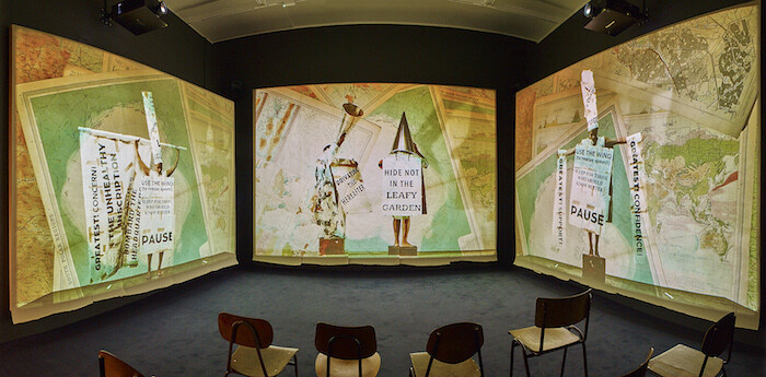 There was little experimentation with small, modest arrangements around town, with most galleries opting for immersive projects and large-scale installations. At Pilar Corrias, Ian Cheng presents a massive single-screen projection of a live simulation, Emissary Forks At Perfection (2015), the second part of a series of works that explore the history and the possible future of cognitive evolution. “Emissary Forks At Perfection” presents a foreign, futuristic, terrifying landscape inhabited by Shiba Inu dogs (yes, the ones from the memes) and accompanied by a vinyl wall text, a diagram simulating how the world has gotten to that point. To be introduced into this world by this fatalistic text and the animal we now associate with internet silliness is an alienating experience only enhanced by the grand, wall-sized presentation. At Fiona Banner’s solo at Frith Street Gallery, the video Phantom (SS16) (2015) portrays the artist’s recent publication, an illustrated version of Joseph Conrad’s masterpiece novel recounting the dread of colonialism Heart of Darkness (1899), carried by a drone in the wind. The projection slips beyond the wall to smear the image over the floor and furniture, as if the space cannot incorporate the work fully. It’s accompanied by Font (2015), a typeface project designed as an amalgamation of fonts Banner has used for sculptural and publication projects in the past, an attempt to create something new that can contain the old within it, it is legible while laden with history.