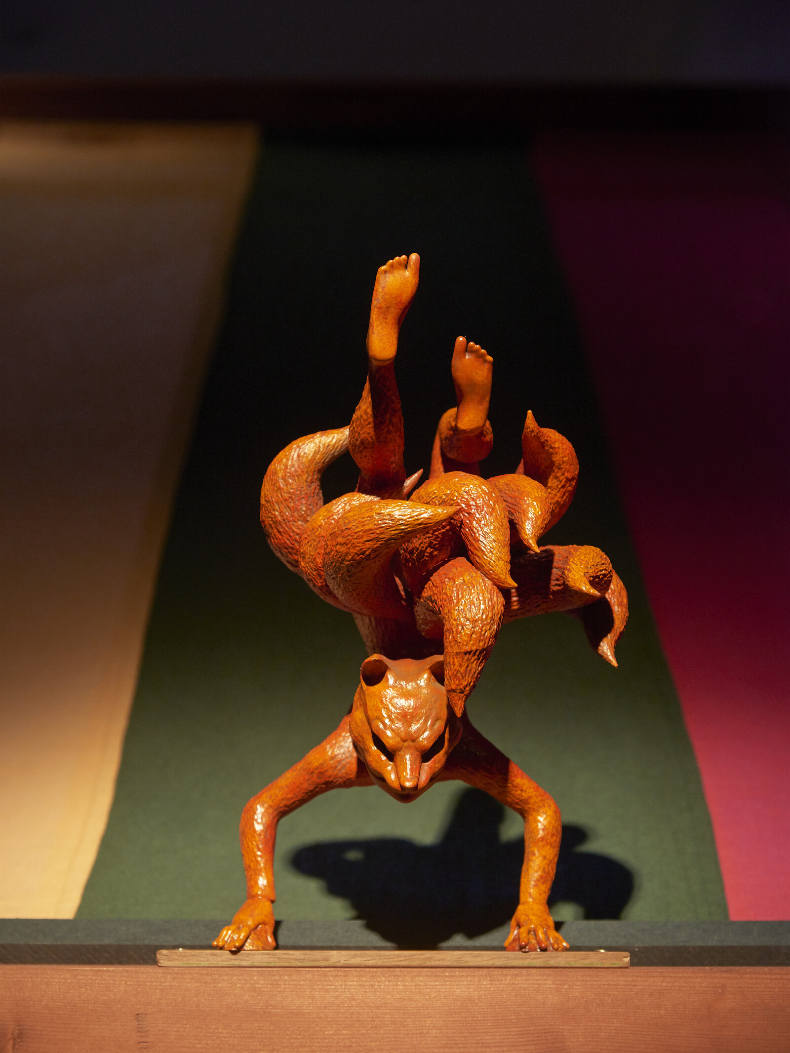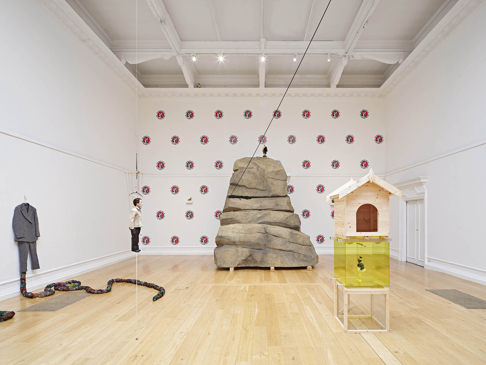 The same impulse might also lie behind the present wave of figuration: amidst the maelstrom, attempts to pin the world for a brief time. Simeon Barclay’s “In the Name of the Father,” at South London Gallery, is one of a number of exhibitions to remix and reinhabit figures of the past. It riffs on other artists: Beuysian felt suits with Mike Kelley-like trails of plush toys running out from their pant legs, Brancusi-style stacks of blue plastic barrels, Lutz Bacher-esque use of a Darth Vader cardboard cutout. Iceberg (2022) is a column with a hutch with its door hanging expectantly open, atop which sits a yellow Perspex box and a small, wooden doghouse. Trapped in the Perspex is a puppet: a carved self-portrait of the artist in a Donald Duck outfit. This tragicomic figure, caught somewhere between escape and domestication, faces off with another puppet named Walls in the Head (2022). This man with a bruised face is meant to be a character from the film Scum (1979)⎯ it looks to me like a young, street-fighting Gilles Deleuze.