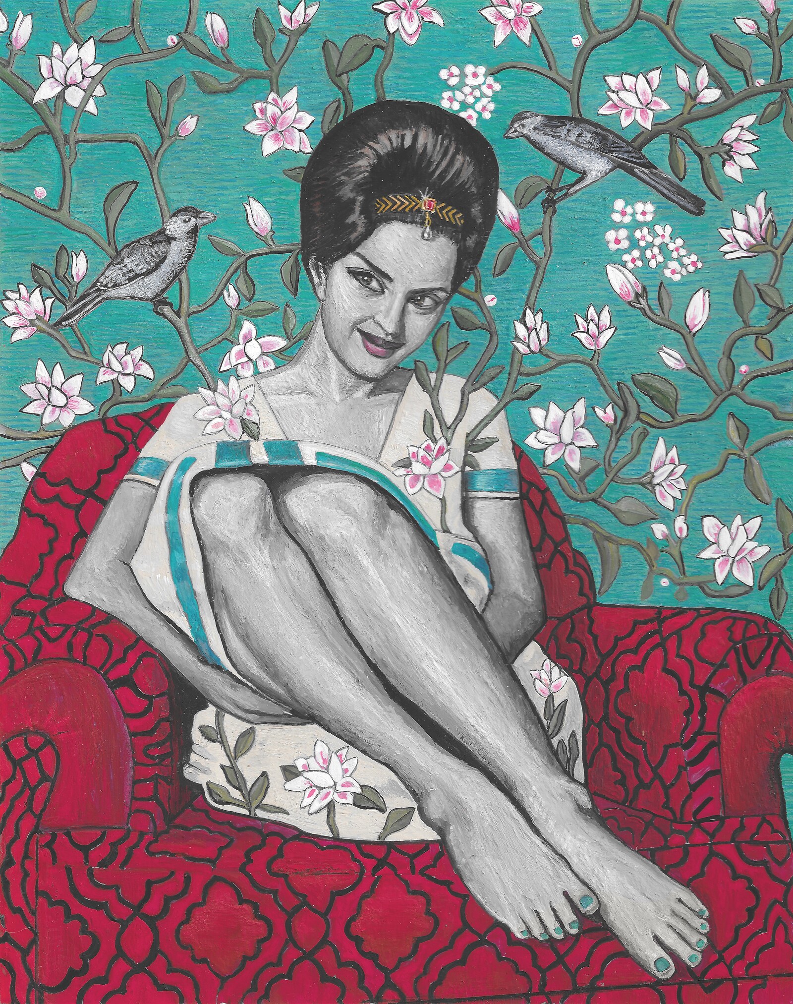 The floor and walls of the Barbican Curve are a deep turquoise, lined with intricately hand-painted geometric patterns. Along the long wall are a set of small, framed portrait drawings of women writers, actors, musicians, directors, and pop stars who shaped the Iranian cultural landscape before the 1979 revolution. In The Woman in the Mirror (Portrait of Fereshteh Jenabi) (2021), one of the works comprising Soheila Sokhanvari’s solo commission “Rebel Rebel,” a woman sits facing away from us on the floor combing her hair; we see her reflection in a mirror. She is colored in grayscale pencil, while the mirror sits on a detailed red carpet, orange floral patterned curtains in the background. A biographical note explains that Jenabi was a groundbreaking actress who was sentenced to death after the revolution and went into hiding for two decades.