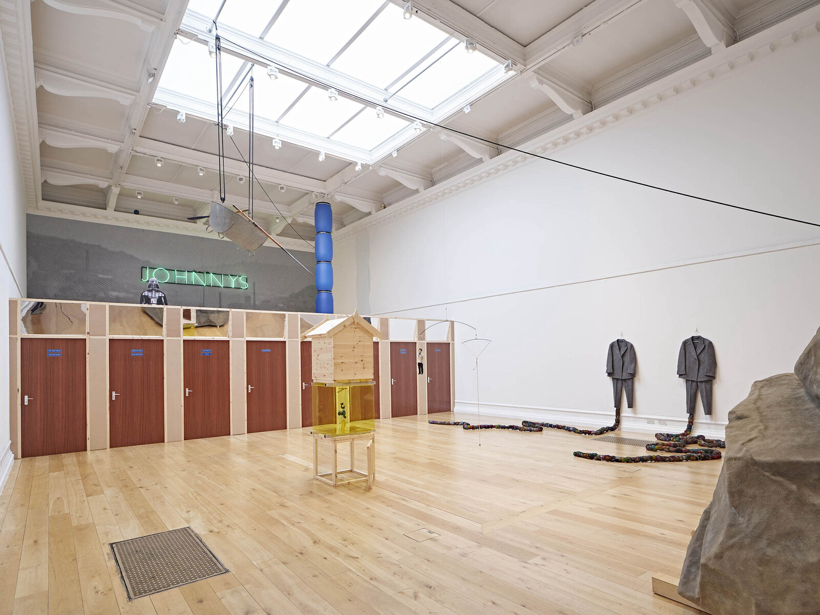 The room is bisected by Higher Purchase (2022), a line of eight nondescript closed doors each with a small blue sign. “BRIGHT INFERIORITY BRINK / MUTE RUIN” reads one, like the office of some inscrutable purgatorial bureaucracy. All the doors I try are locked. “GRIT LOCAL GUARD / INSTITUTE LOST WAITING VISIBLE” is the only one that eventually opens. Though there’s no particular insight or reward: sure, there’s the base of a few of the works that you saw peeking over the partition, and two fairly generic geometric canvases, but all I really get is being on the other side of the doors. You can try killing your idols to escape the past but, Barclay suggests, it doesn’t lead anywhere.