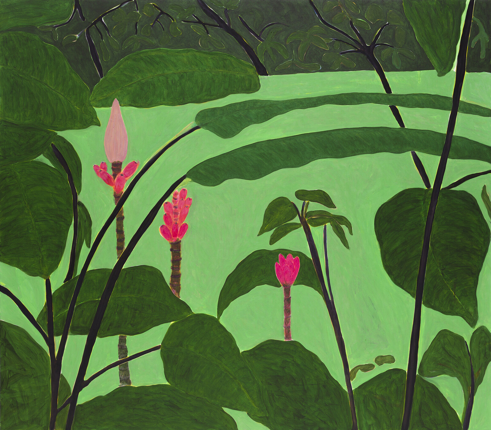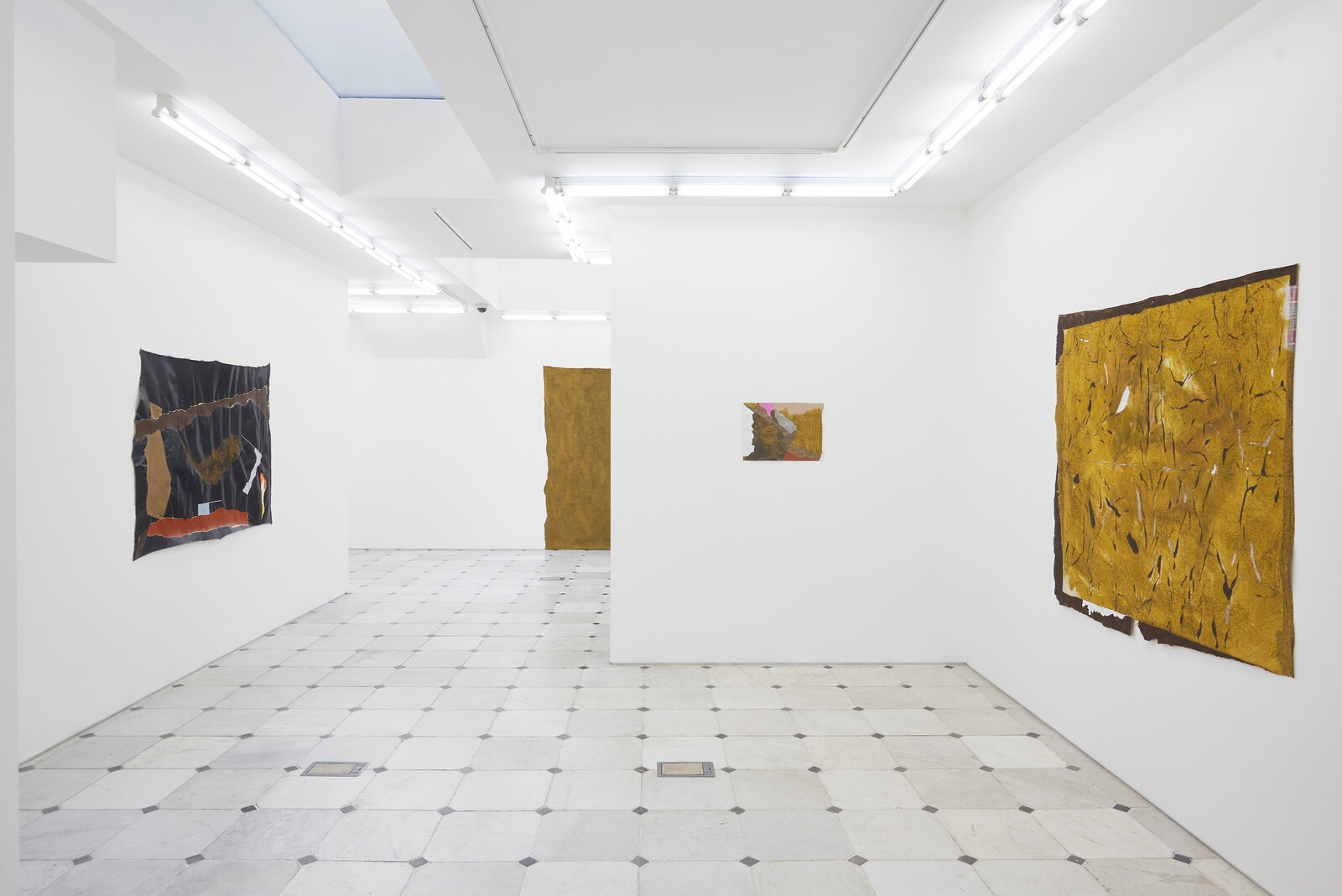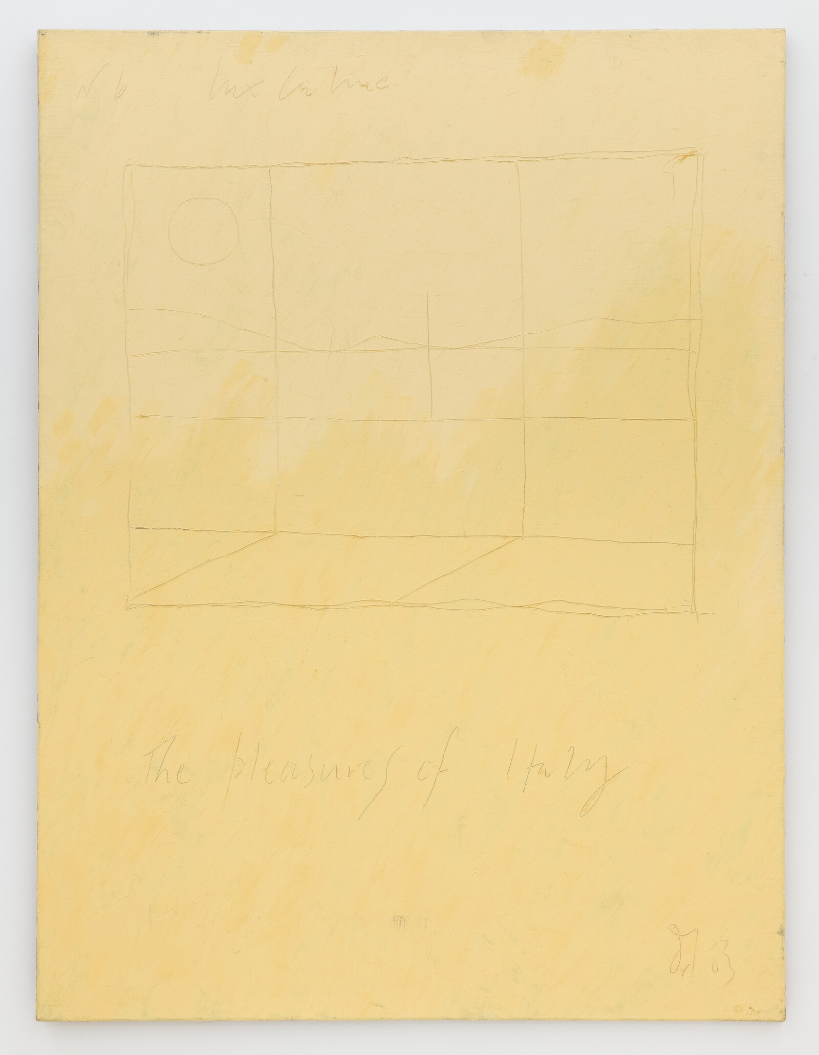 Visiting numerous exhibitions in the same day means that certain visual cues become personal markers of what you’ve seen, a series of connections that feel private. The unfurling wallpaper in Helen’s apartment reminds me of the unstretched canvases by Francis Offman at Herald St’s Bloomsbury gallery. Offman’s abstract paintings, in tones of black, yellow, green, and brown, are hammered directly into the wall. They vary in scale and shape, and yet they all somehow read as landscapes, as if the green could only ever be grass, the browns sand, the blacks a night sky. Or perhaps at a time of narrowed horizons, such landscapes feel like harbingers of a different reality. Seeing Patricia Leite’s paintings at Thomas Dane, the first thought that occurred to me was just how different an image of Brazil they provide—the vividly colored flowers, fauna, and seascapes—in comparison to the Covid-19 crisis imagery that accompanies every report on the country in the news these days. Another loaded sense of landscape is found in “When yellow wishes to ingratiate it becomes gold,” an exhibition of paintings by Derek Jarman at Amanda Wilkinson. Dating from 1982 to ’92, around the time Jarman was diagnosed as HIV positive, the paintings’ relationship to their subjects is restricted but also playful, questioning the world while depicting it. Untitled (Yellow Painting – The Pleasures of Italy) (1983) shows a sketchy geometry where the circle in the top left could be the Italian sun and the diagonal line maybe a horizon at sea or a mountain range. Or maybe I’m just thinking that because of the cursive text underneath the image reading “The pleasures of Italy.”