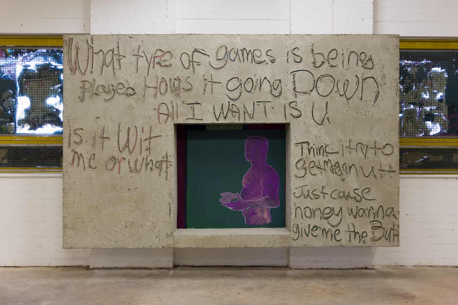 A text-to-painting relationship is also central in Alvaro Barrington’s exhibition “My words will live forever-Fuck my Name” at Emalin. One of two concurrent solo exhibitions by Barrington, at the gallery’s permanent space and another temporary one around the corner, “My words…” is dedicated to musician DMX, who died earlier this year. Portraits of DMX are embedded in painted wooden boxes covered in cement, onto which the artist has carved fragments of DMX lyrics (“all I know is pain,” “is it wit me or what”). Going down (2021), a portrait in acrylic and oil on paper and snippets of carpeting, is painted in green and purple, a gentle and funerary tribute to the late rapper’s love of orchids.